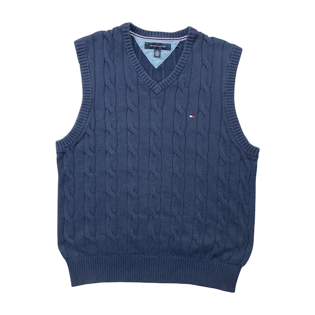 USA 古着 TOMMY HILFIGER トミーヒルフィガー コットン Vネック ケーブル ニットベスト メンズM ネイビー 紺色 BI0149