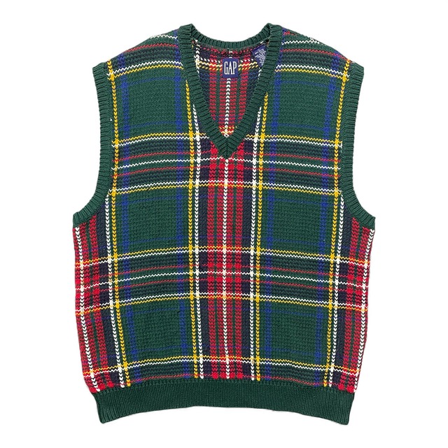 USA 古着 90S GAP ヴィンテージ オールド ギャップ コットンニット ベスト タータンチェック ニットベスト メンズXL グリーン BI0135