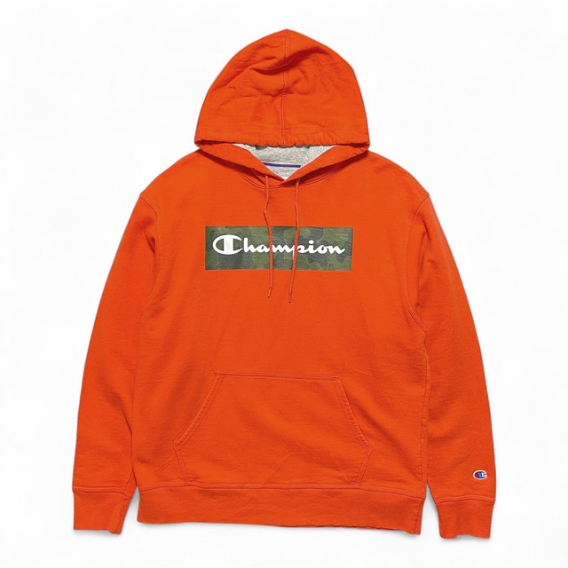 USA 古着 Champion チャンピオン ボックスロゴ カモフラ フーディー スウェットパーカー オレンジ メンズL トレーナー BE0921