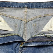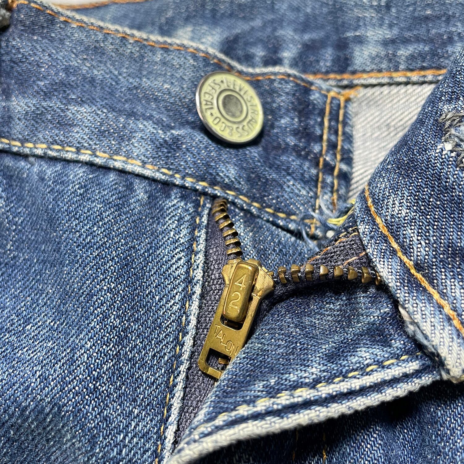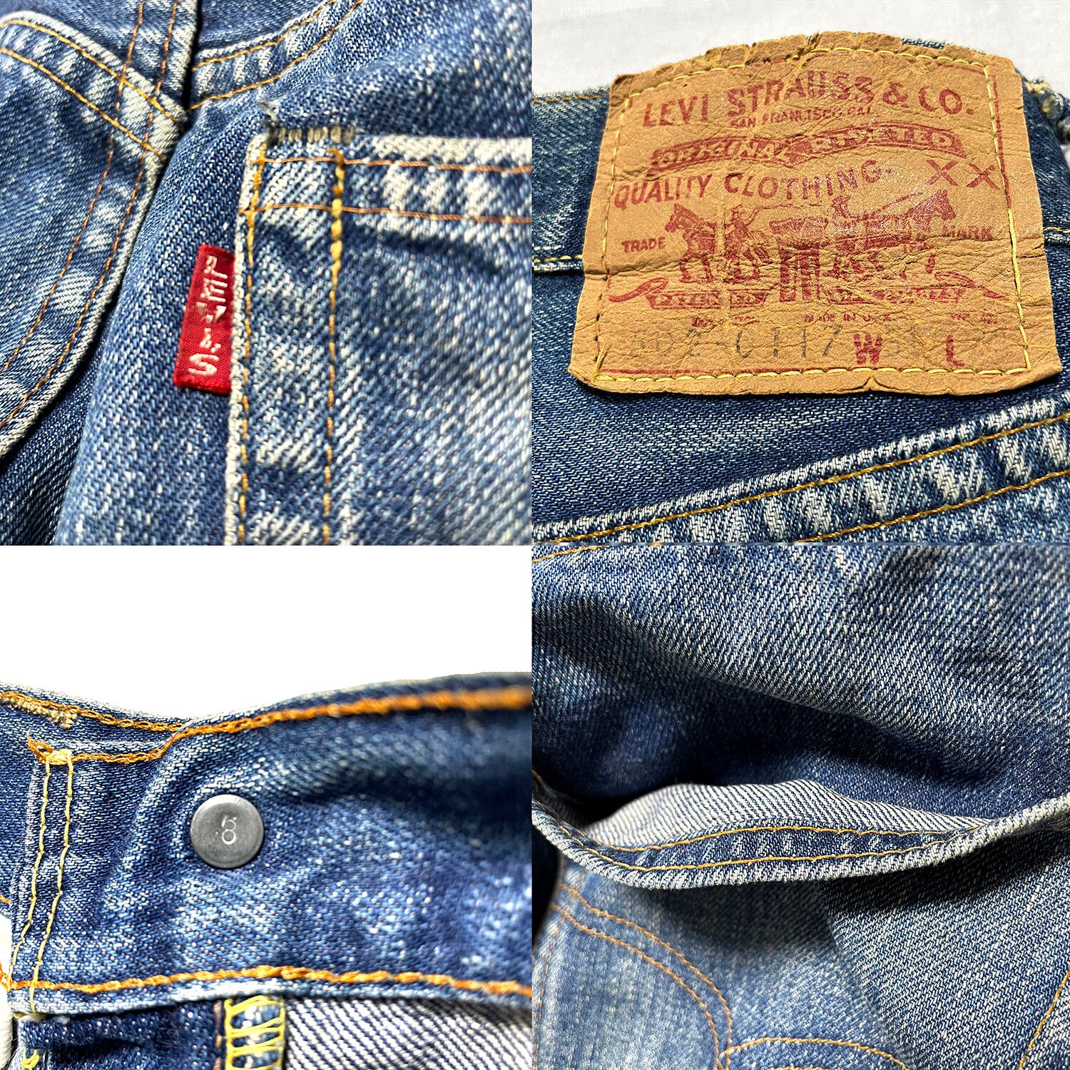 ディテール:トップボタン裏8 赤耳 バックポケット裏シングル 赤タブ ビッグE フロントジップ42タロン 一部イエローステッチ