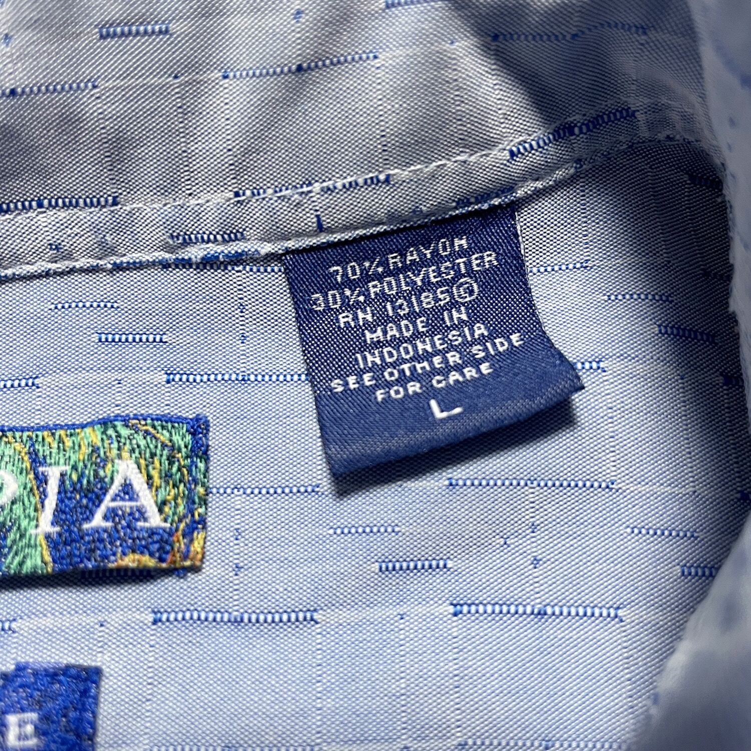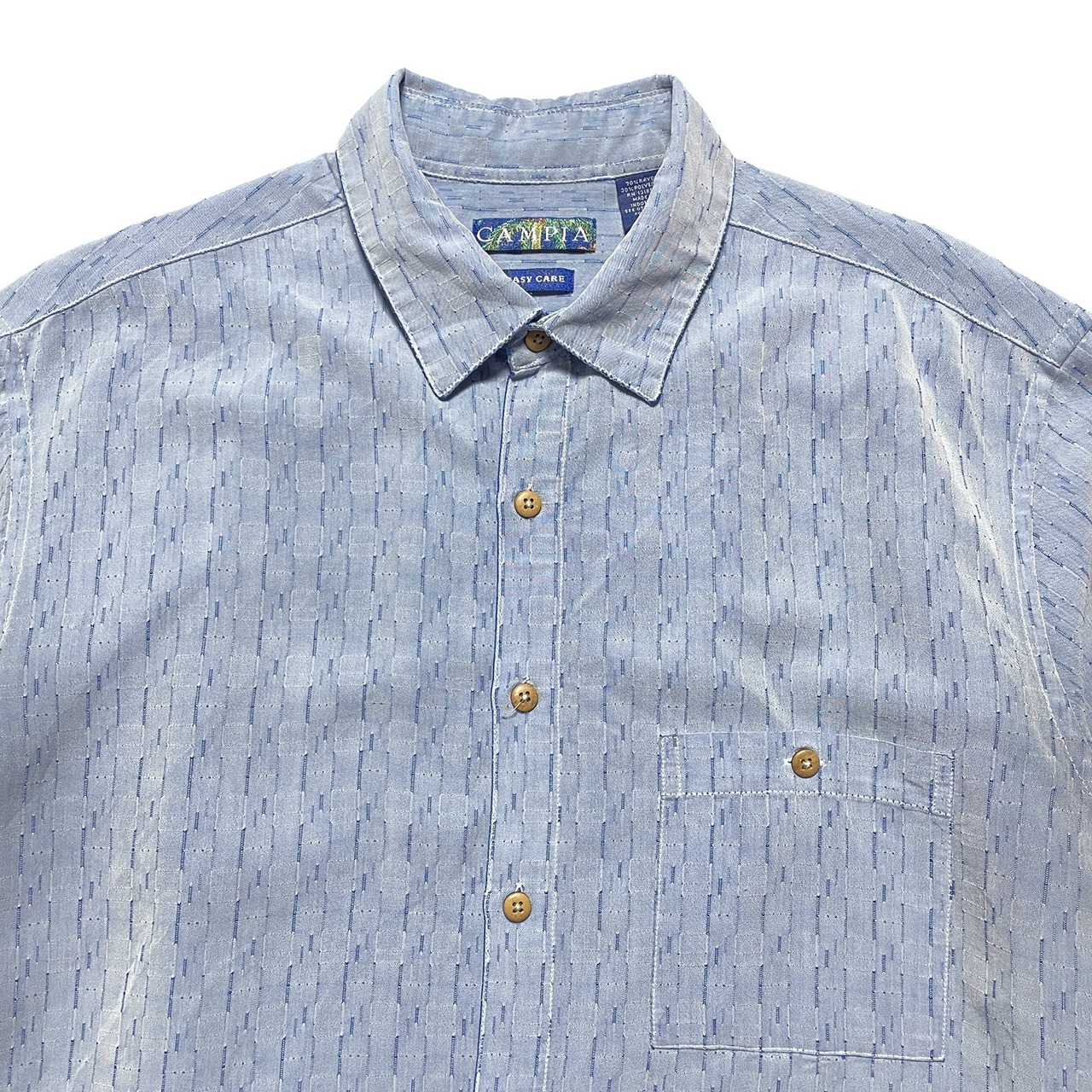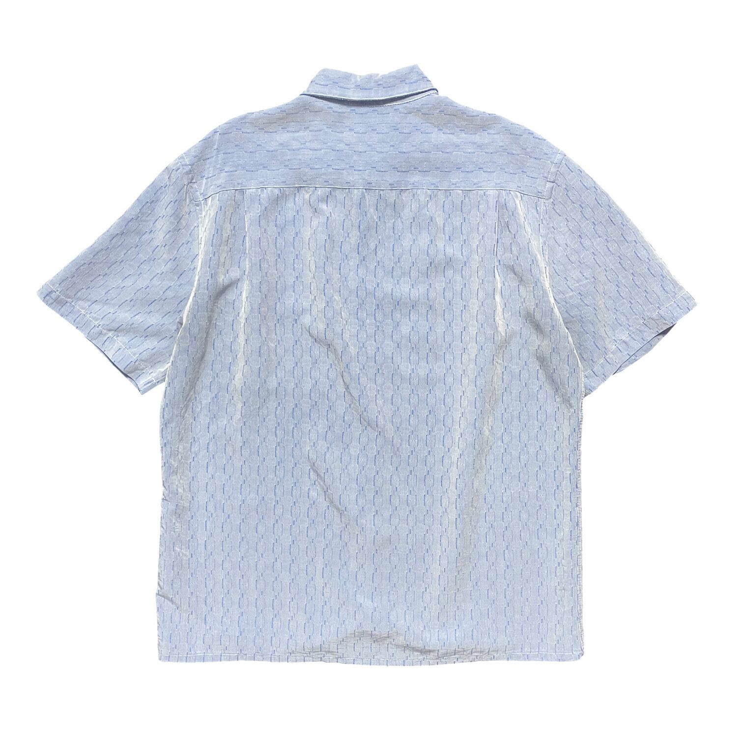 USA 古着 CAMPIA カンピア レーヨン/ポリエステル 半袖シャツ レーヨンシャツ メンズL 光沢ブルー系 総柄 ヴィンテージ BF2417