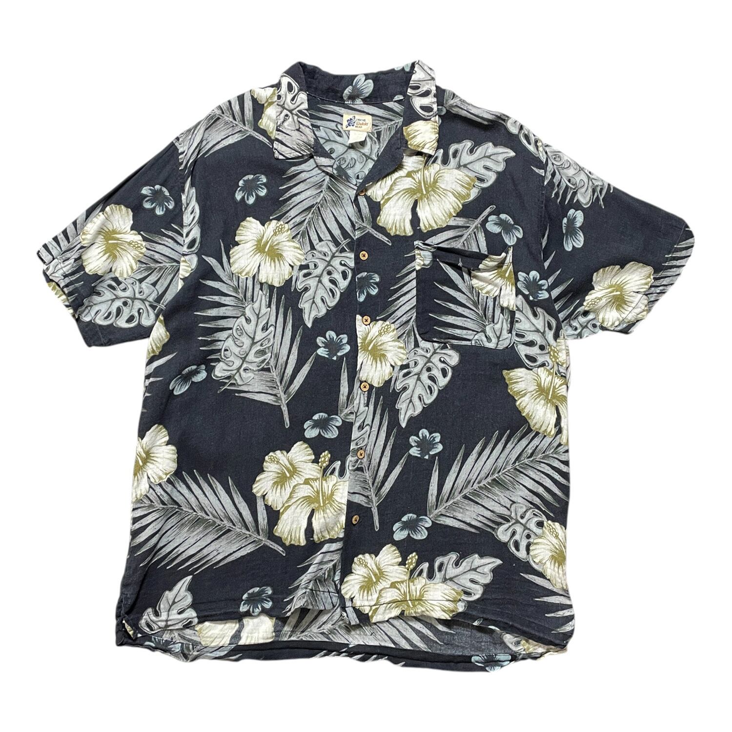 USA 古着 CHEROKEE チェロキー コットン/レーヨン アロハシャツ ハワイアンシャツ ハイビスカス柄 リーフ柄 メンズXL ブラック系 BF2513