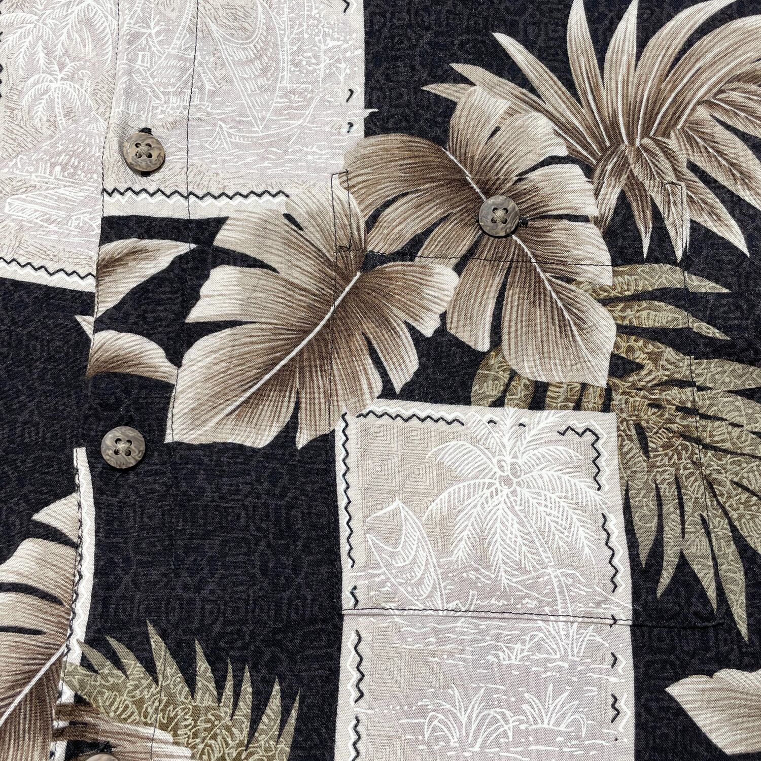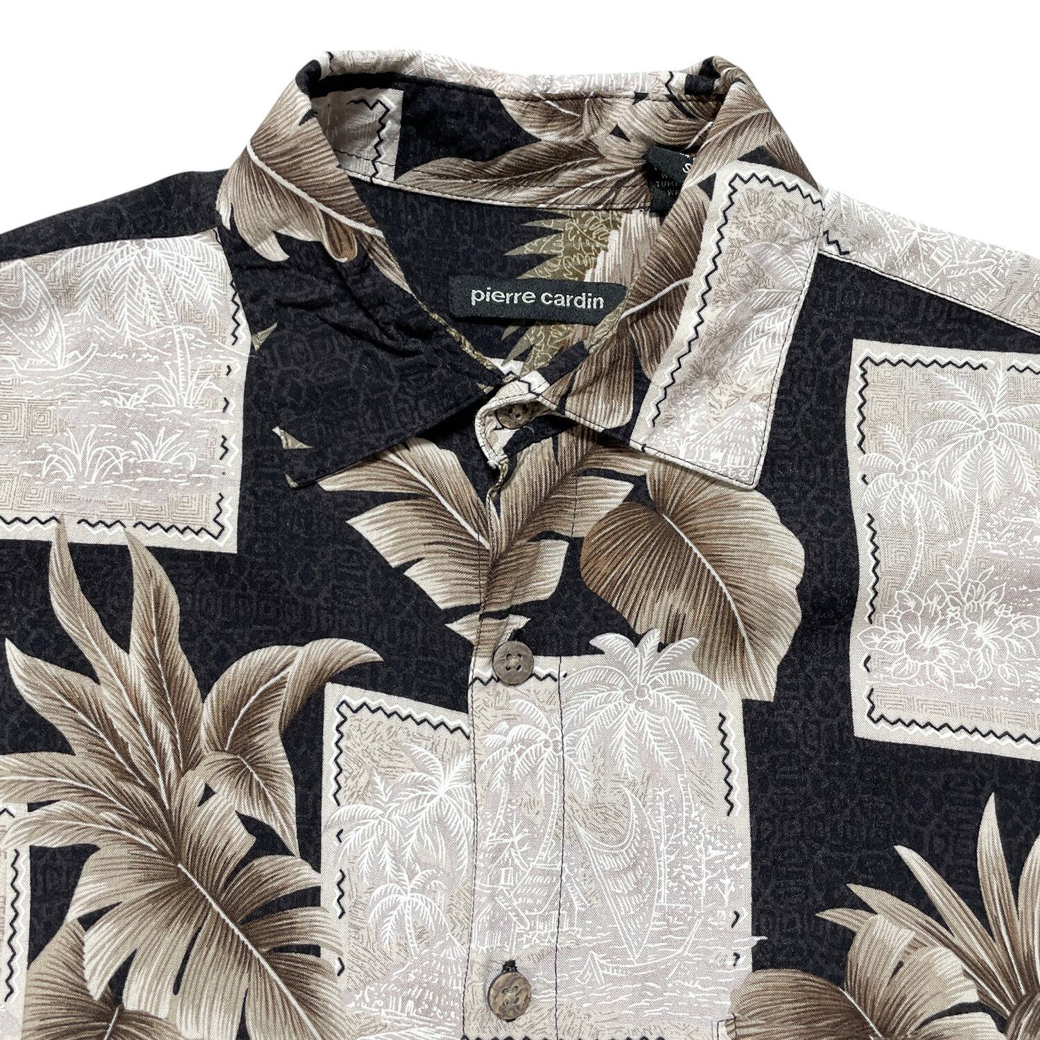 USA 古着 ピエールカルダン Pierre Cardin アロハシャツ ハワイアンシャツ レーヨン リーフ柄 ブラック 黒 メンズS BF2551