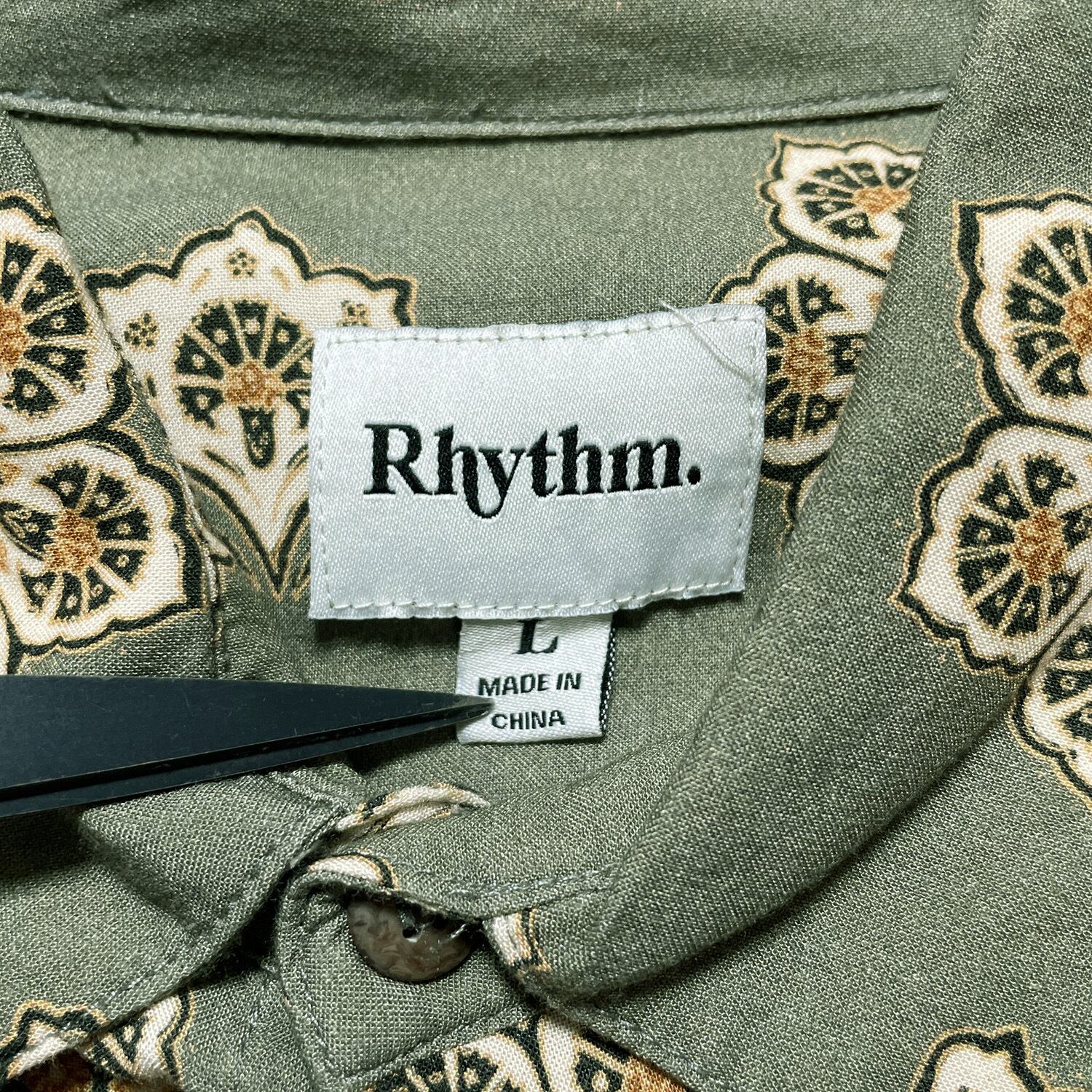 USA 古着 Rhythm ヴィンテージ レーヨン 六葉花 総柄 レーヨンシャツ 半袖シャツ メンズL 薄オリーブ系 BF2659
