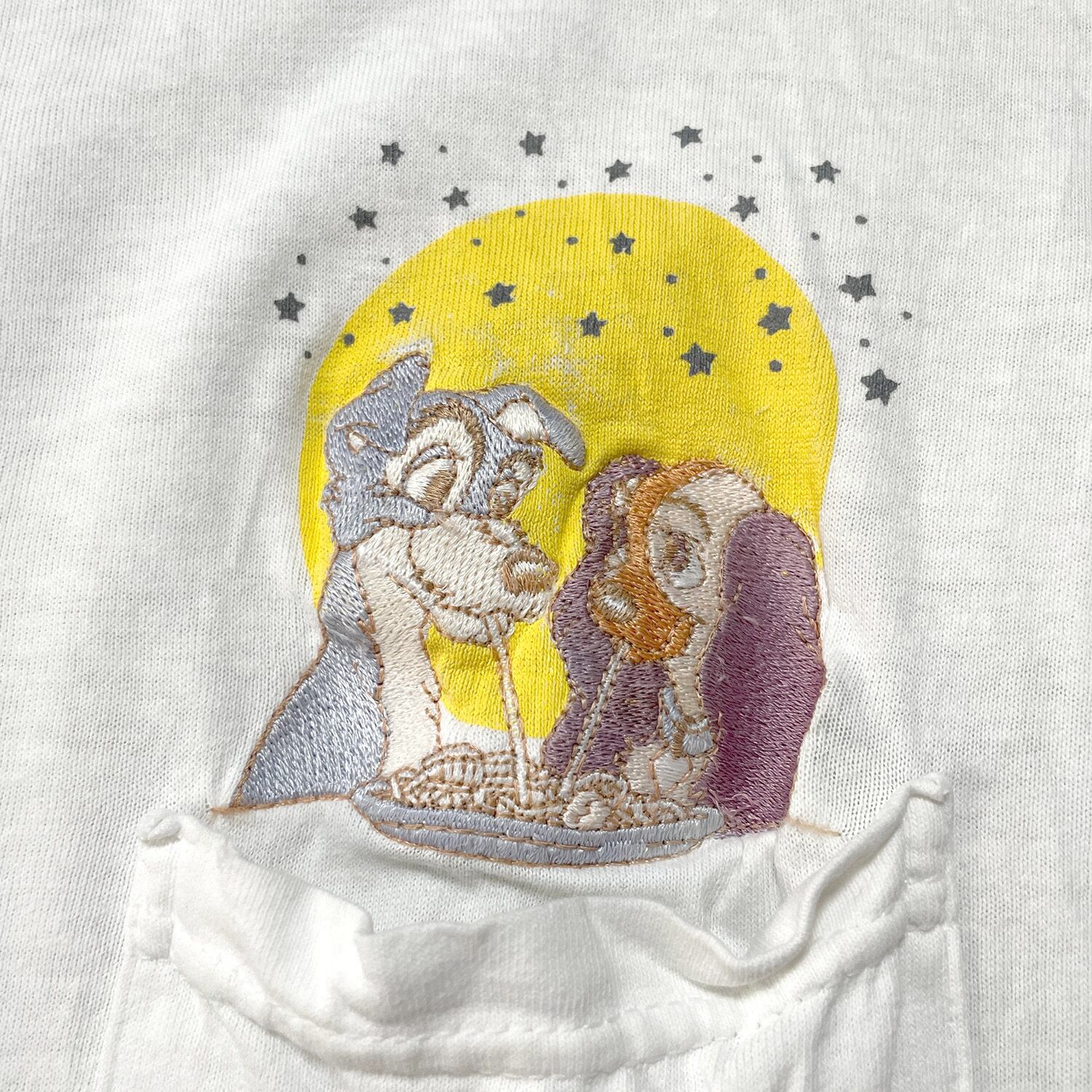 古着 USA製 90S Disney ディズニー わんわん物語 ヴィンテージ Tシャツ 刺繍 ポケT ホワイト シングルステッチ 穴あき ボロ BA3598