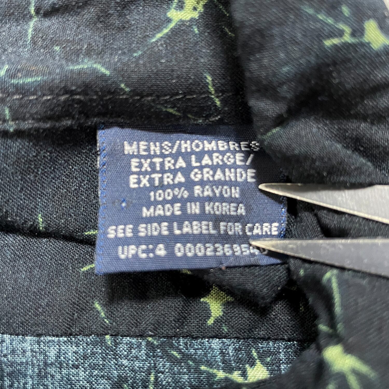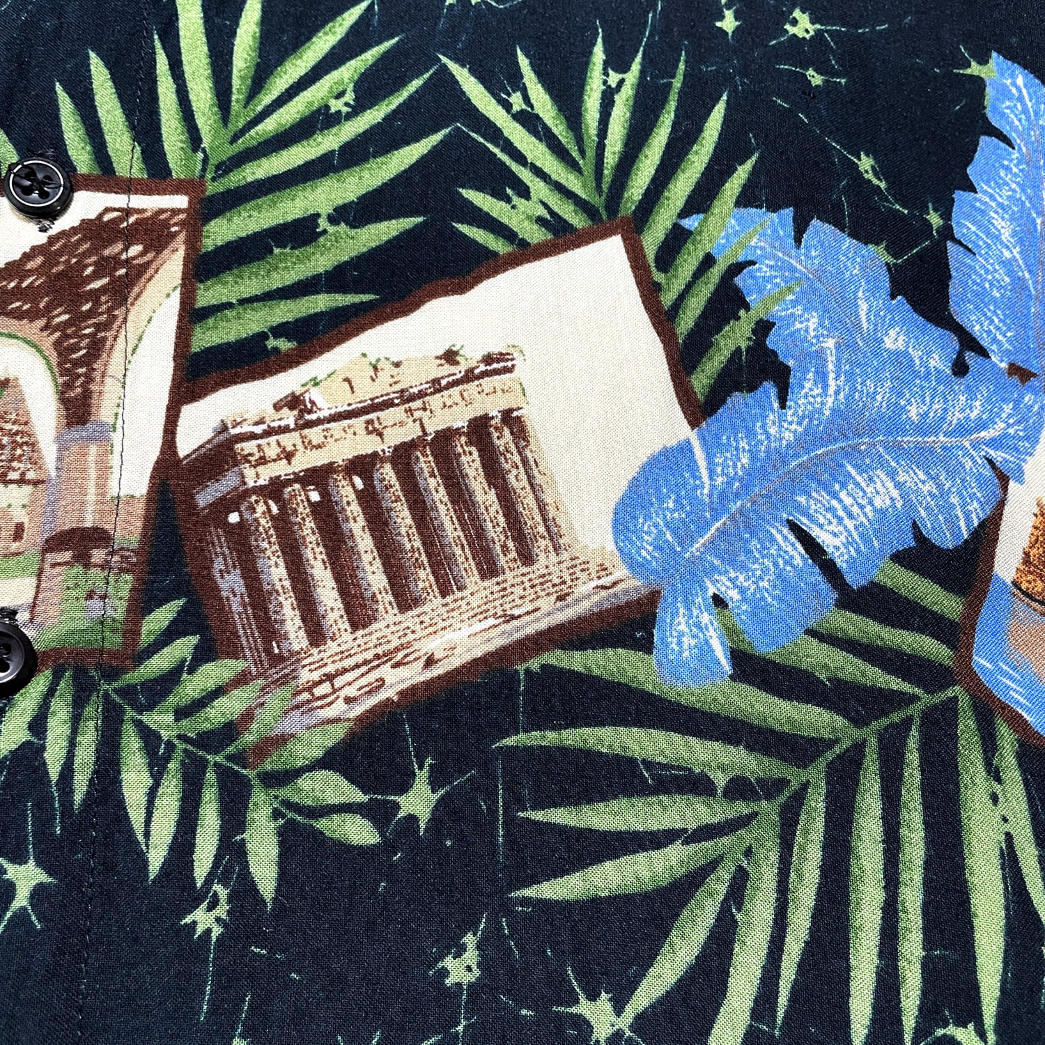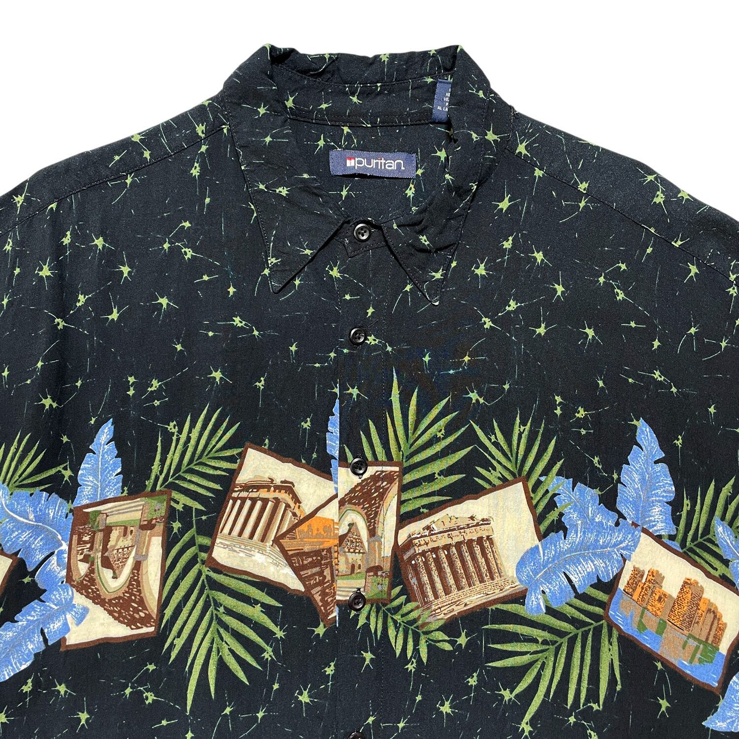 USA 古着 PARITAN ピューリタン レーヨン アロハシャツ ハワイアンシャツ パームツリー ヤシの木 絵はがき メンズL 黒 ブラック BF2790