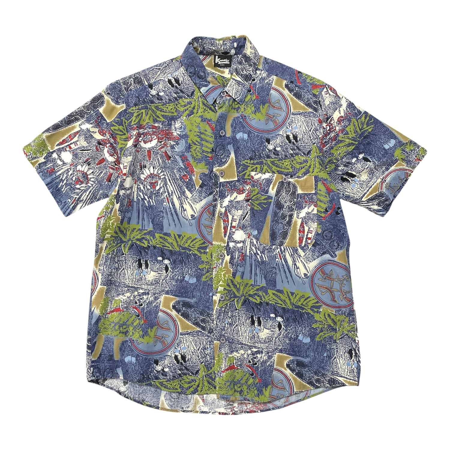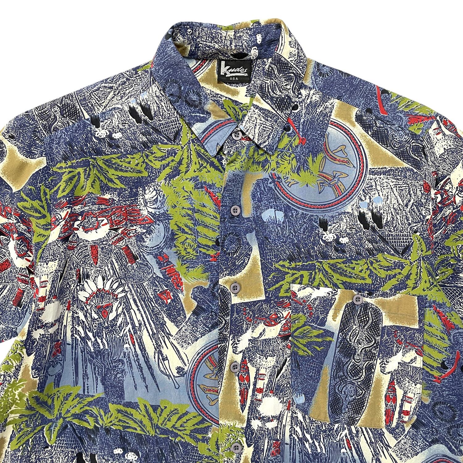 USA 古着 80S USA製 ヴィンテージ コットン/レーヨン アロハシャツ ハワイアンシャツ 総柄 パームツリー柄 メンズM ネイビー系 BF2842