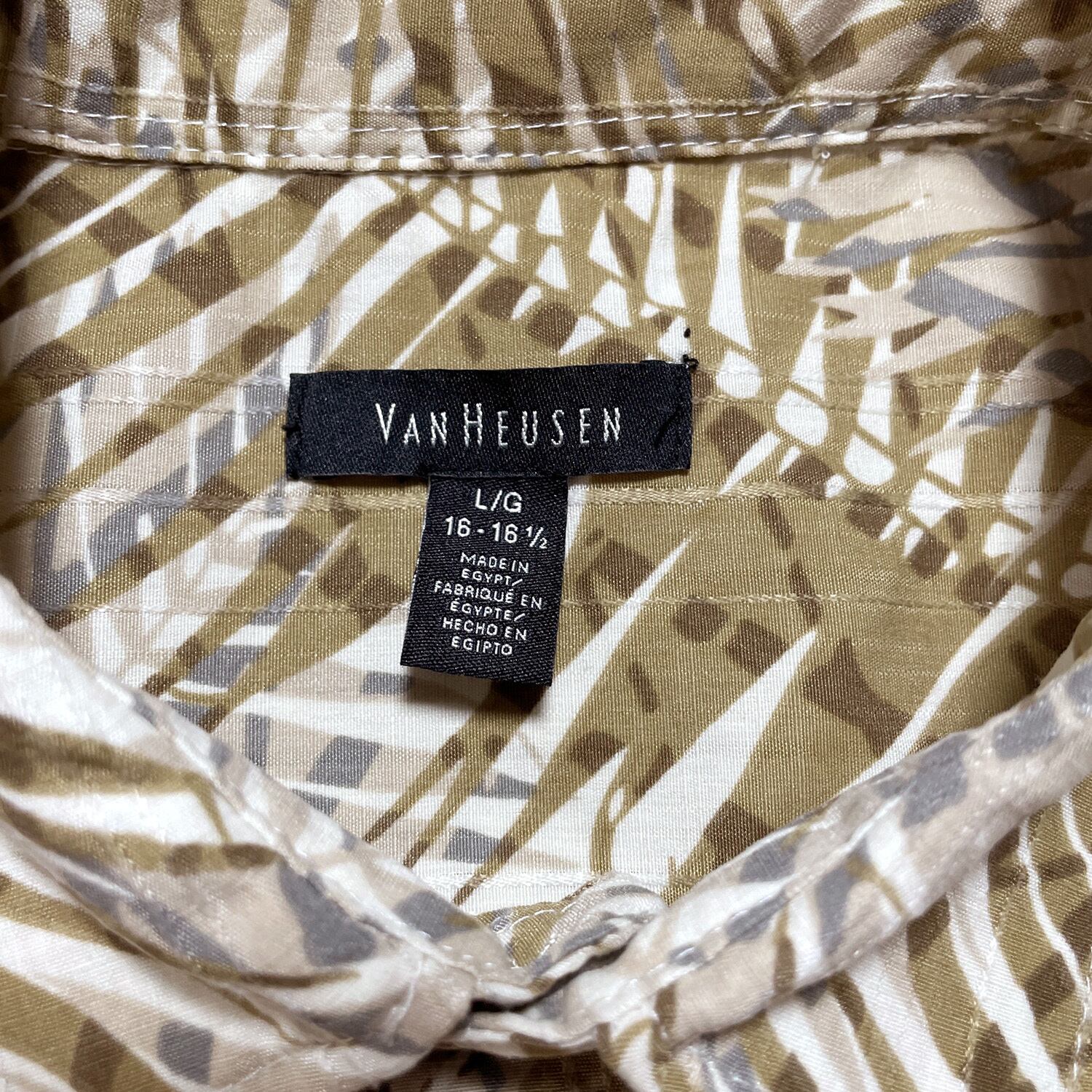 USA 古着 VAN HEUSEN ヴァンヒューセン アロハシャツ ハワイアンシャツ リーフ柄 ベージュ メンズL BF2856