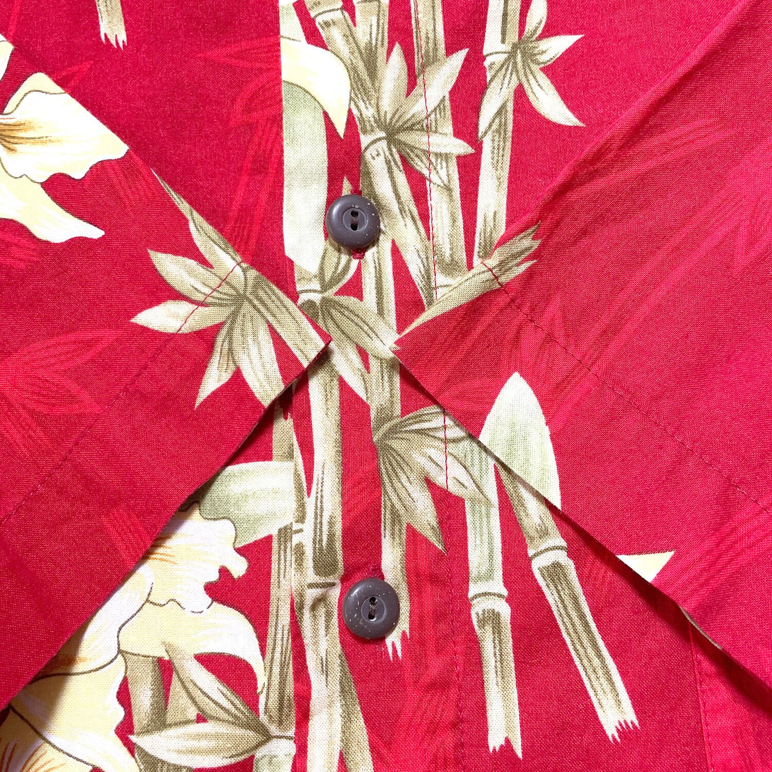 USA 古着 STEVE スティーブ コットン アロハシャツ ハワイアンシャツ 開襟 花柄 竹柄 バンブー メンズXL レッド BF2909