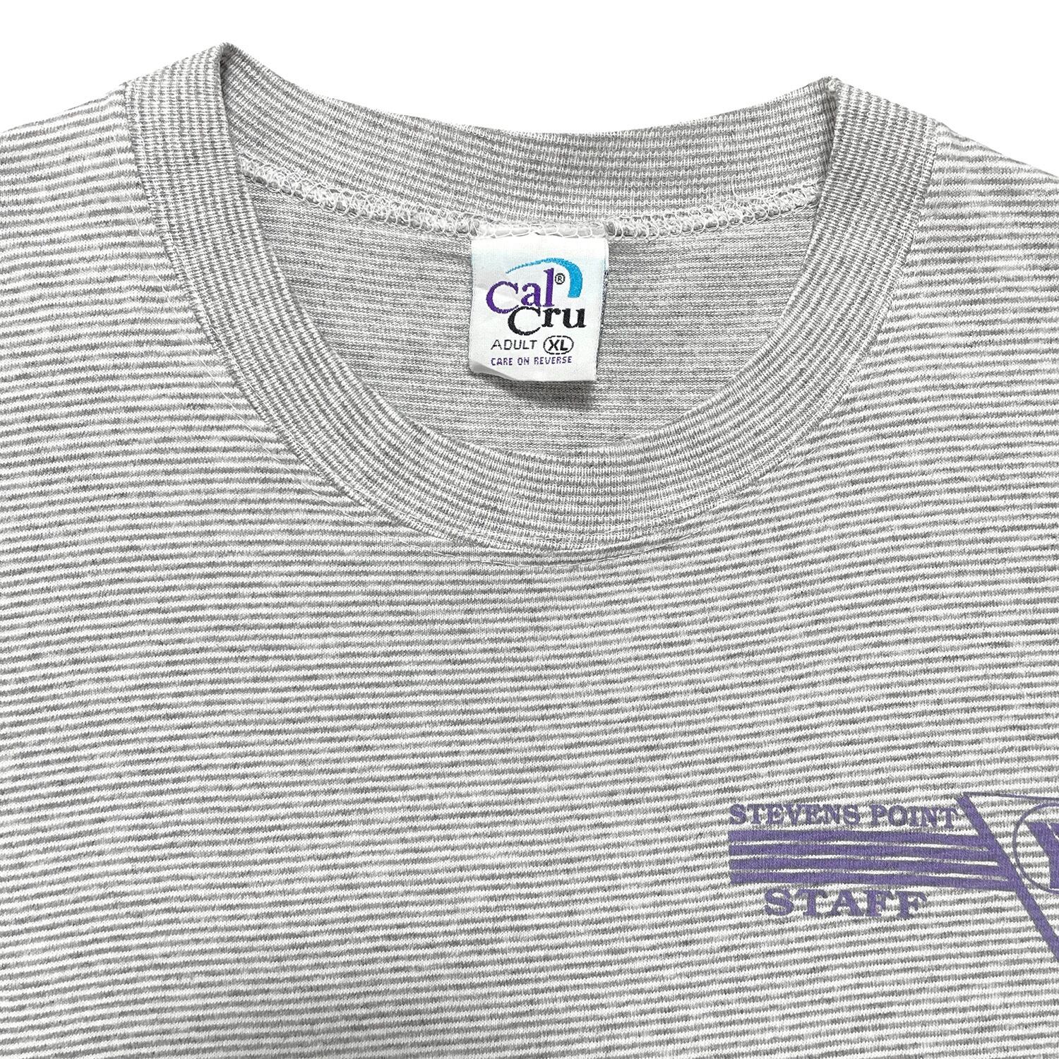 古着 USA製 90S Cal Cru Tシャツ ヴィンテージ 企業系 ワンポイント ボーダー メンズXL グレー シングルステッチ BA3784