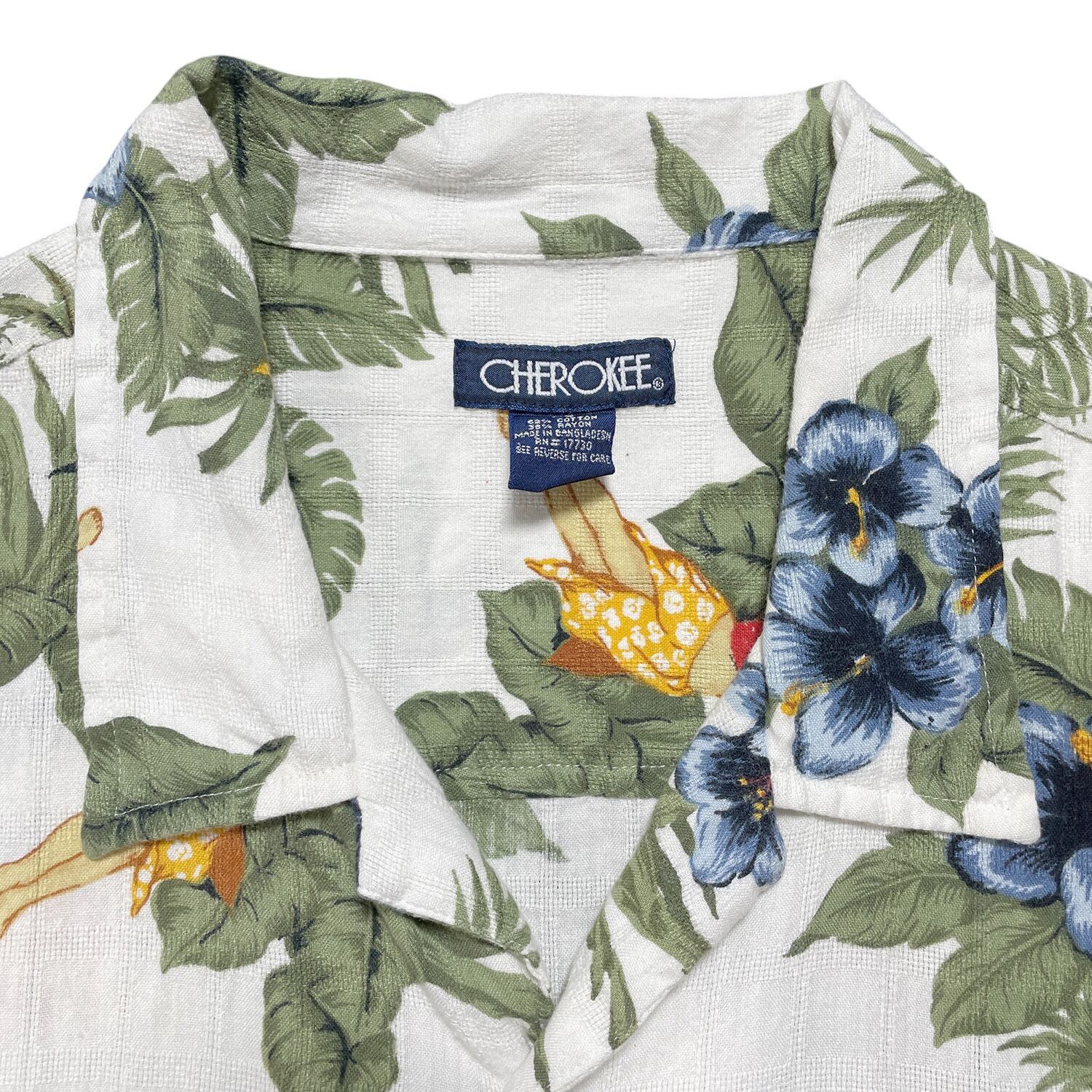 USA 古着 CHEROKEE チェロキー コットン/レーヨン 開襟 アロハシャツ ハワイアンシャツ フラガール ハイビスカス メンズXL ホワイト BF3000
