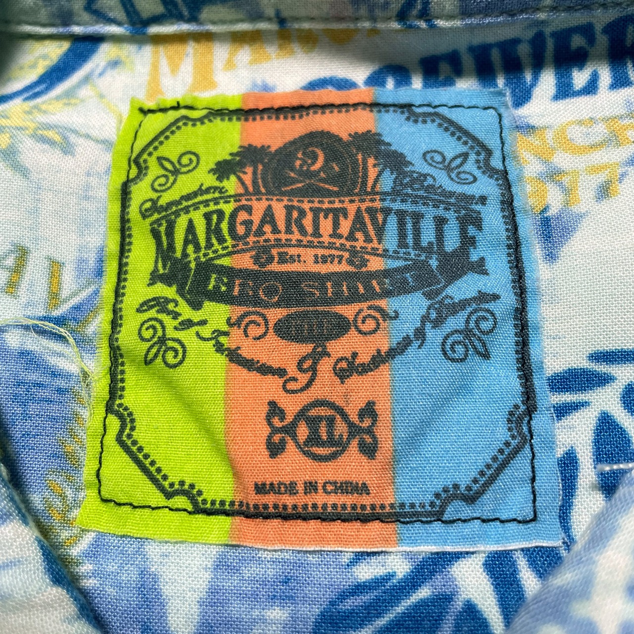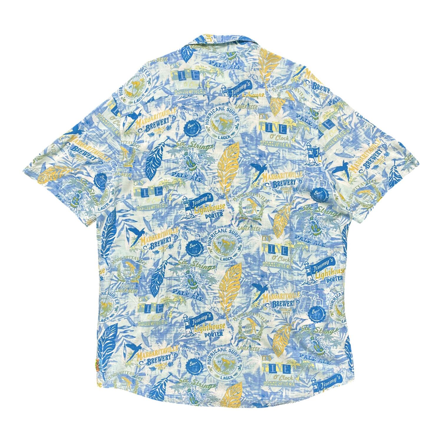 USA 古着 MARGARITAVILLE マルガリータビル レーヨン アロハシャツ ハワイアンシャツ リーフ ビール ロゴ 総柄 メンズXL相当 ブルー BF3054