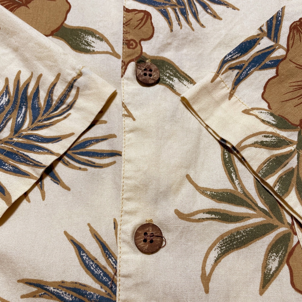 USA 古着 Island Blue アイランドブルー コットン アロハシャツ ハワイアンシャツ リーフ ハイビスカス柄 メンズXL ベージュ系 BF3057