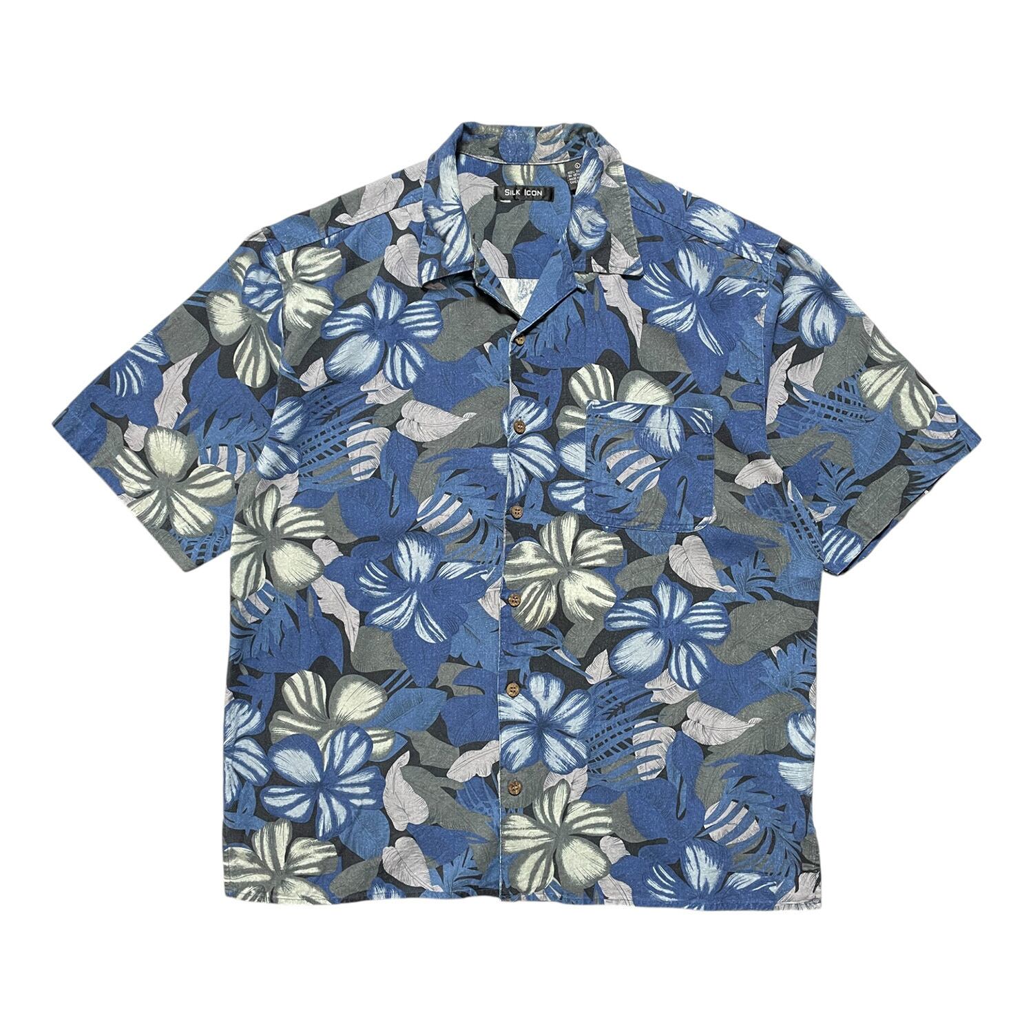 USA 古着 SILK ICON シルクアイコン シルク 開襟 アロハシャツ ハワイアンシャツ ブルーネイビー メンズL ヴィンテージ BF3121