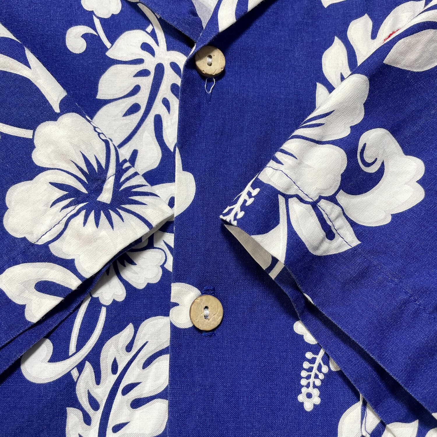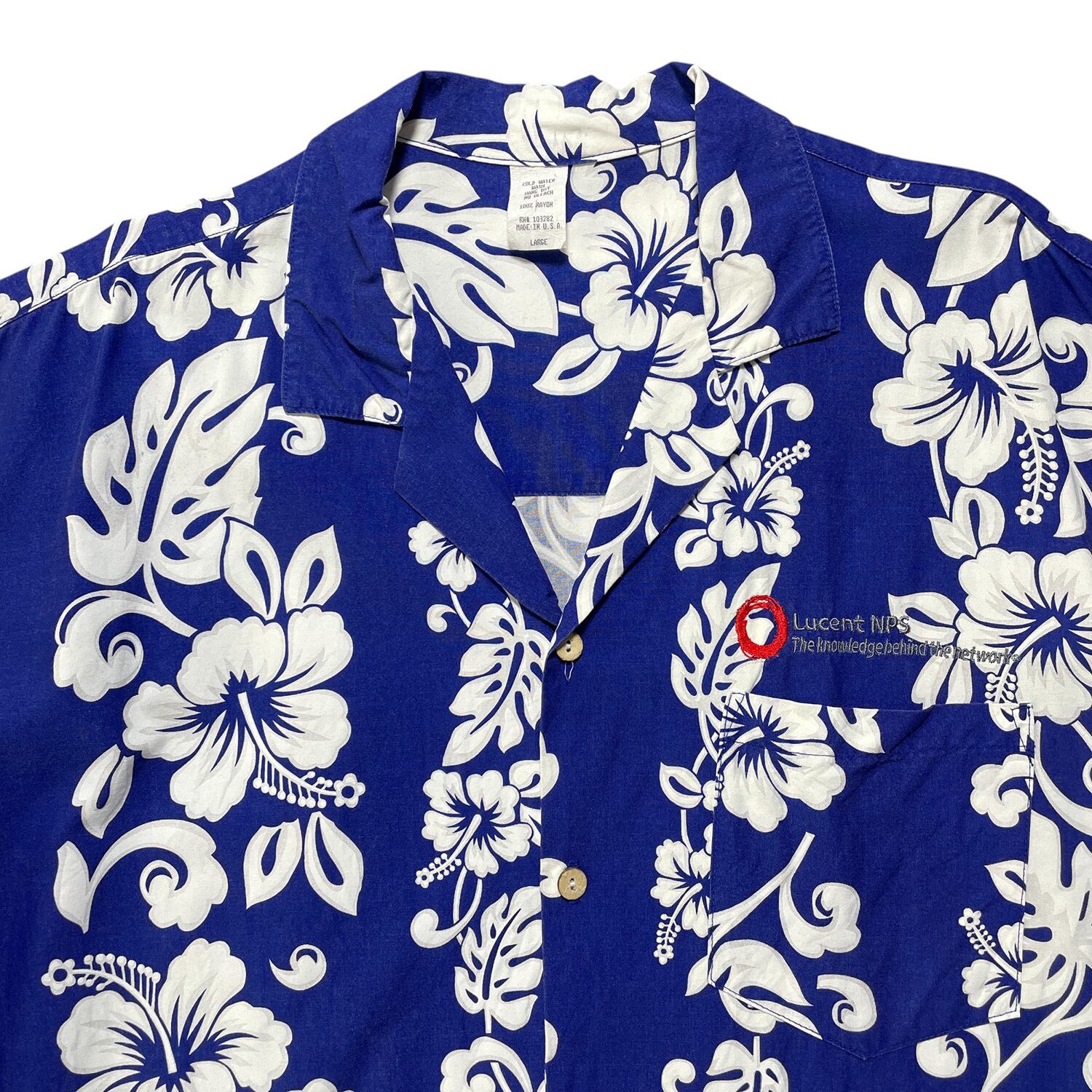 古着 USA製 ヴィンテージ レーヨン 開襟 刺繍ロゴ アロハシャツ ハワイアンシャツ メンズL ブルー リーフ柄 BF3136