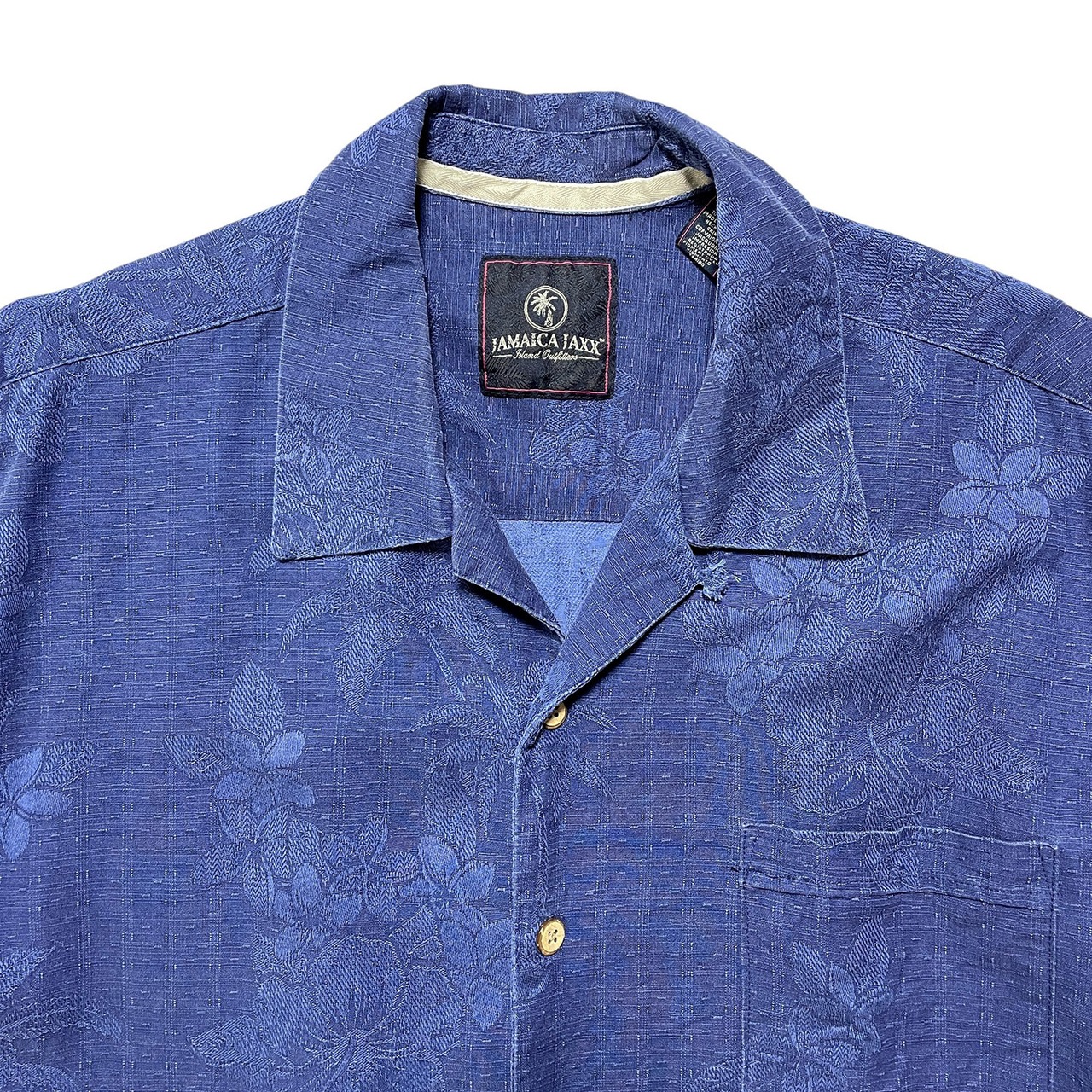 USA 古着 JAMAICA JAXX ジャマイカジャックス シルク アロハシャツ ハワイアンシャツ ジャガード ネイビー メンズXL 開襟 ハイビスカス BF3171