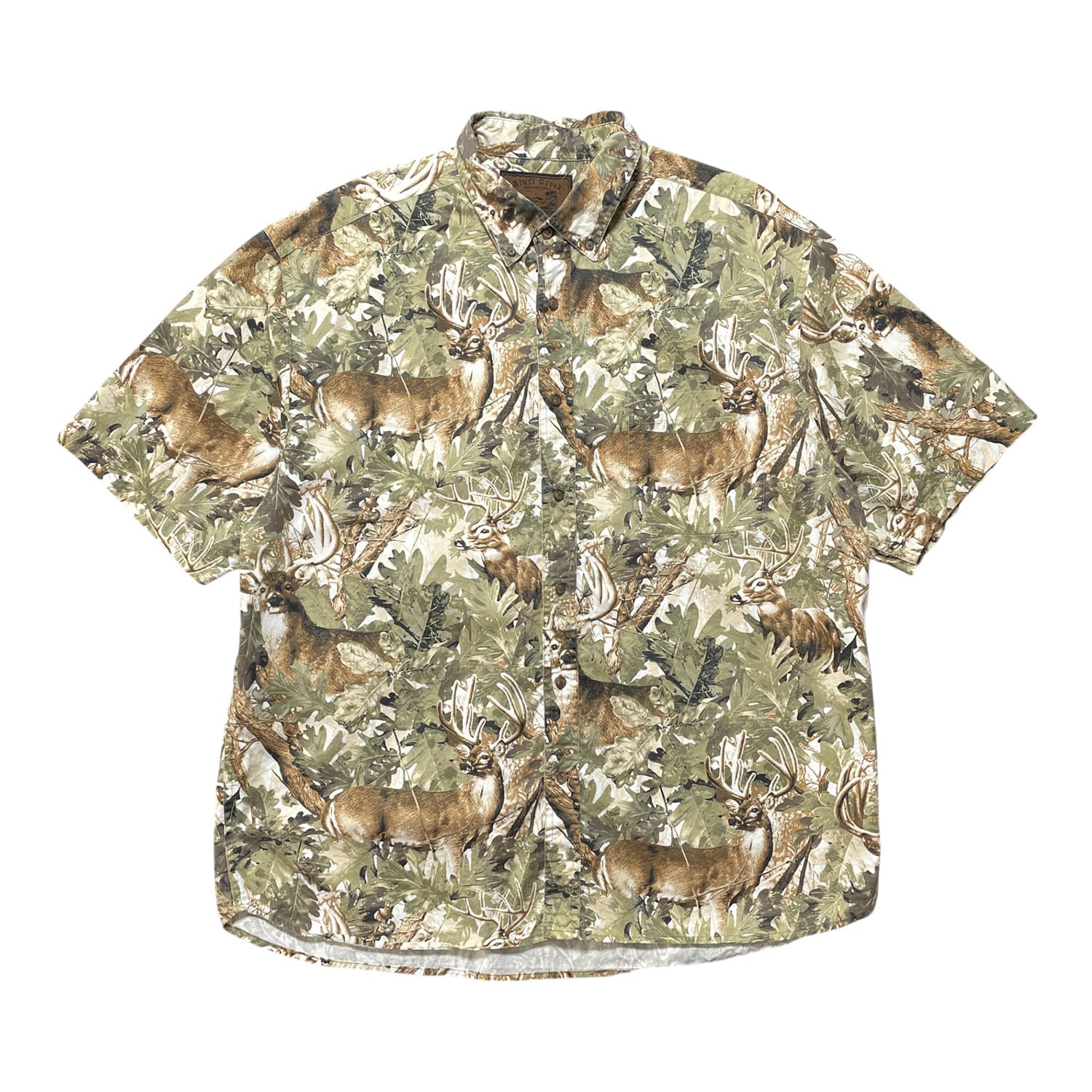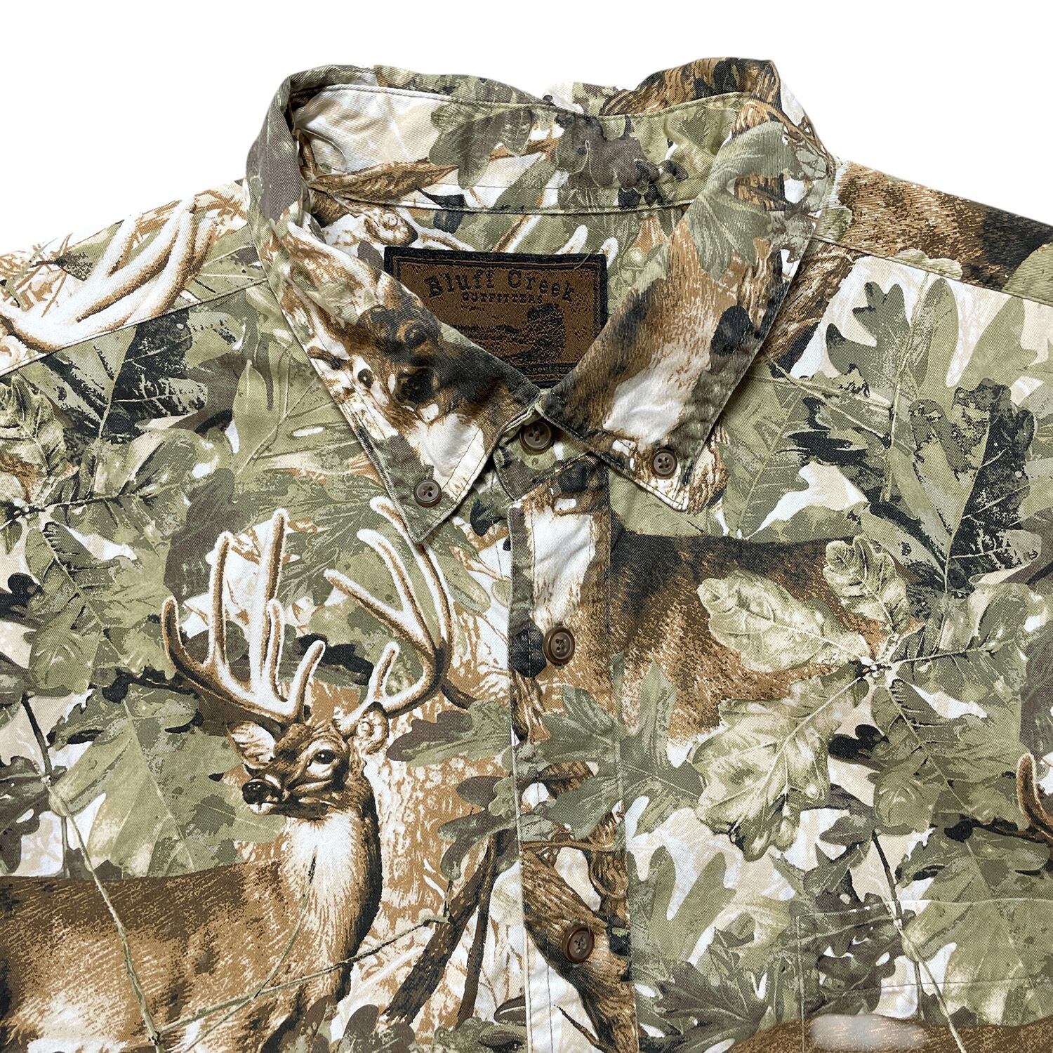 USA 古着 Bluff Creek コットン 半袖シャツ 柄シャツ BD ボタンダウン アニマル シカ柄 メンズXL 鹿 総柄 BF3259