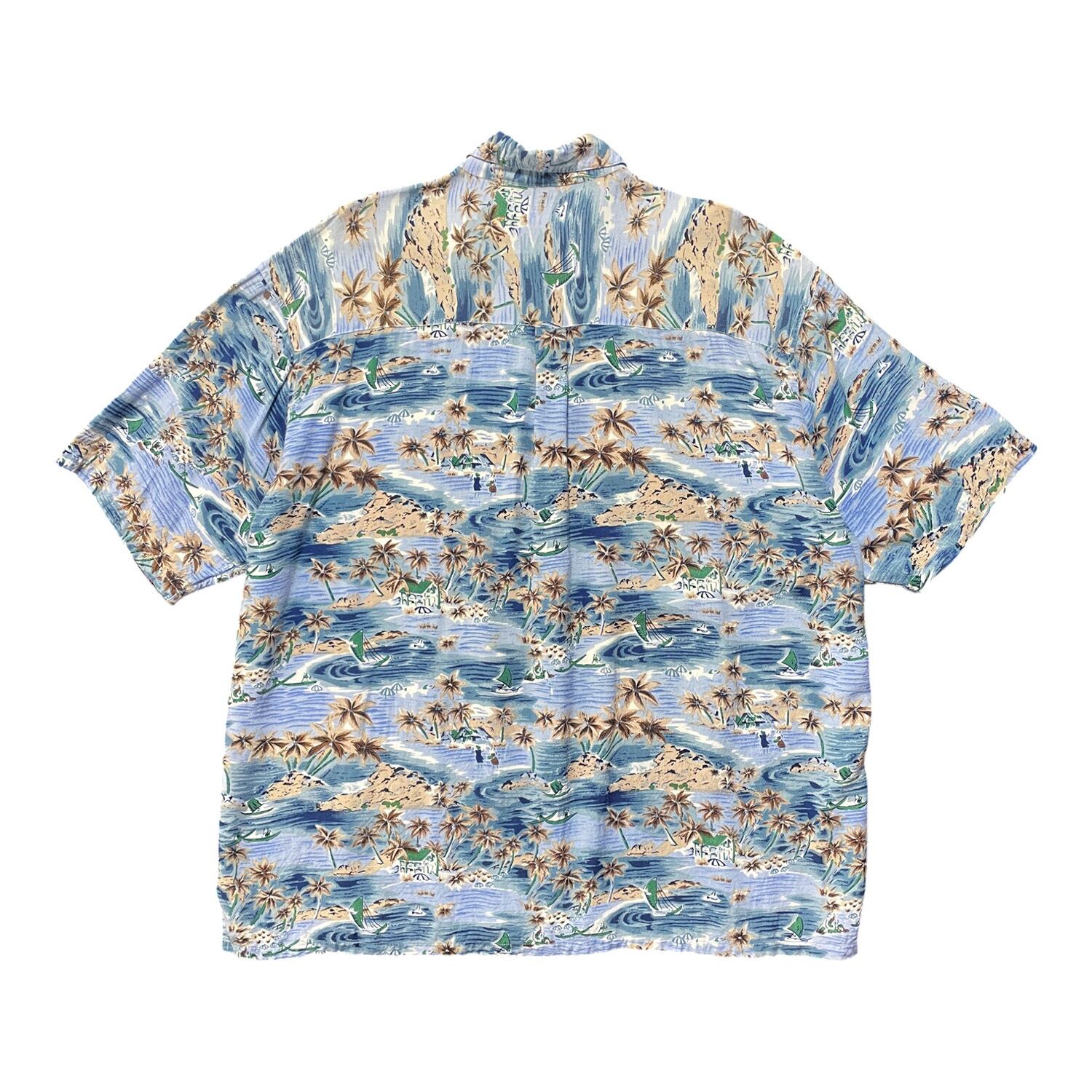 USA 古着 FERROUS レーヨン アロハシャツ ハワイアンシャツ ヤシの木 総柄 ブルー メンズXL BF3260