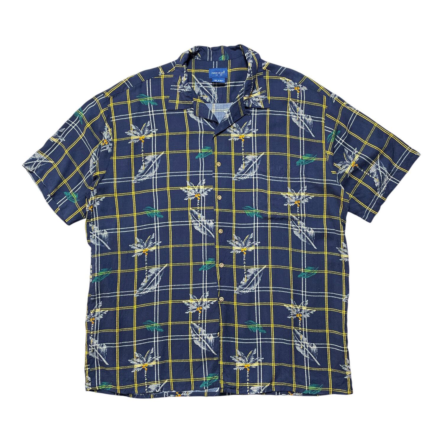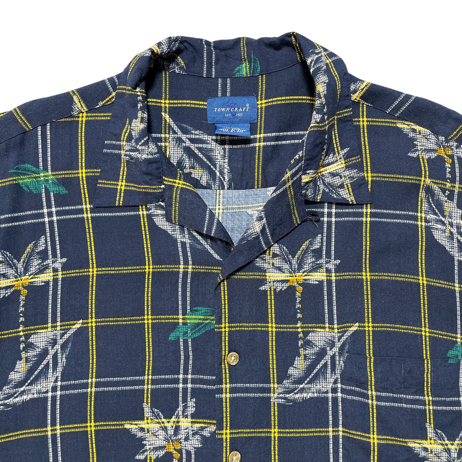 USA 古着 TOWNCRAFT タウンクラフト レーヨン 開襟 アロハシャツ ハワイアンシャツ チェック柄 パームツリー メンズXL ネイビー BF3291
