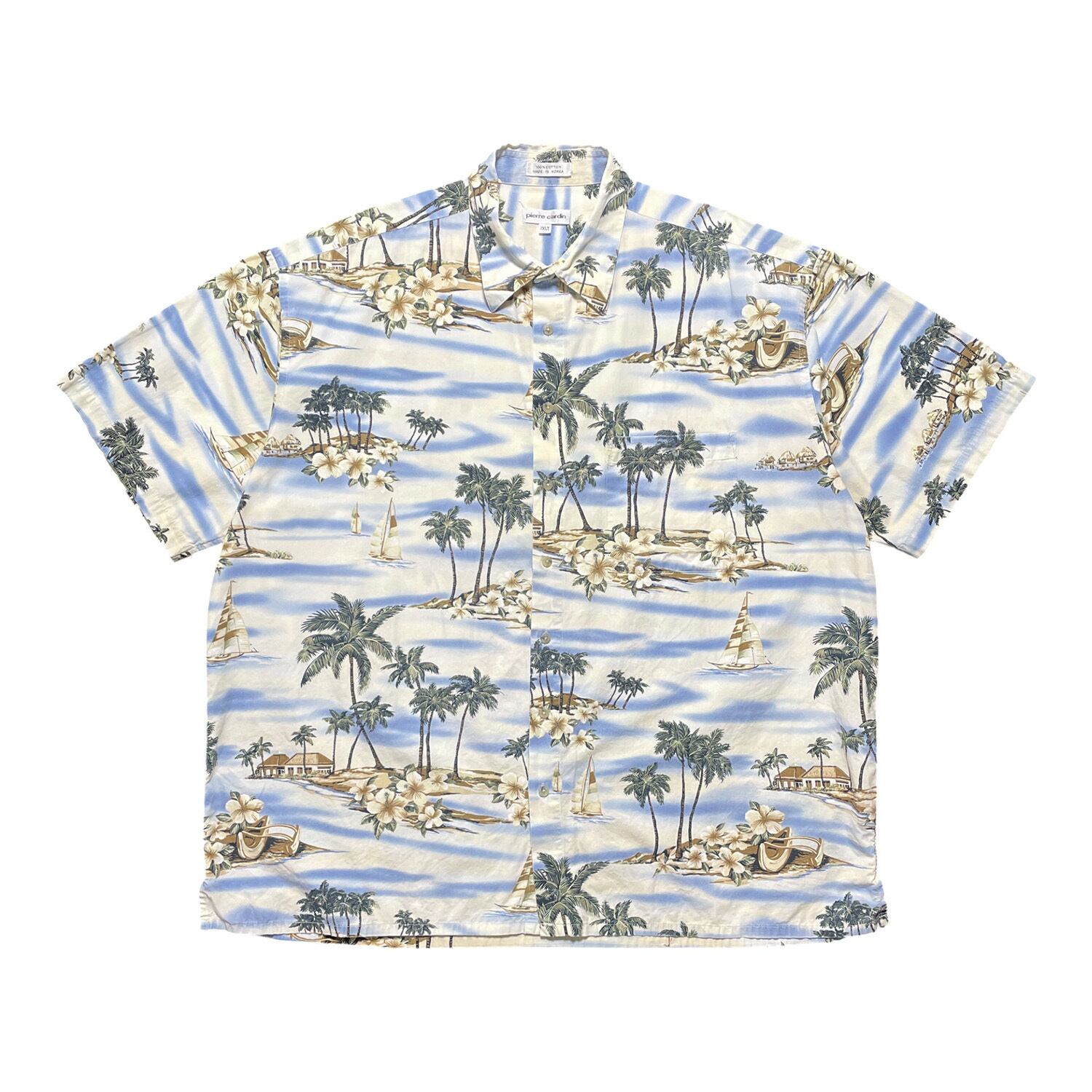 USA 古着 pierre cardin ピエールカルダン コットン アロハシャツ ハワイアンシャツ パームツリー 総柄 メンズ2XL ホワイト系 BF3322