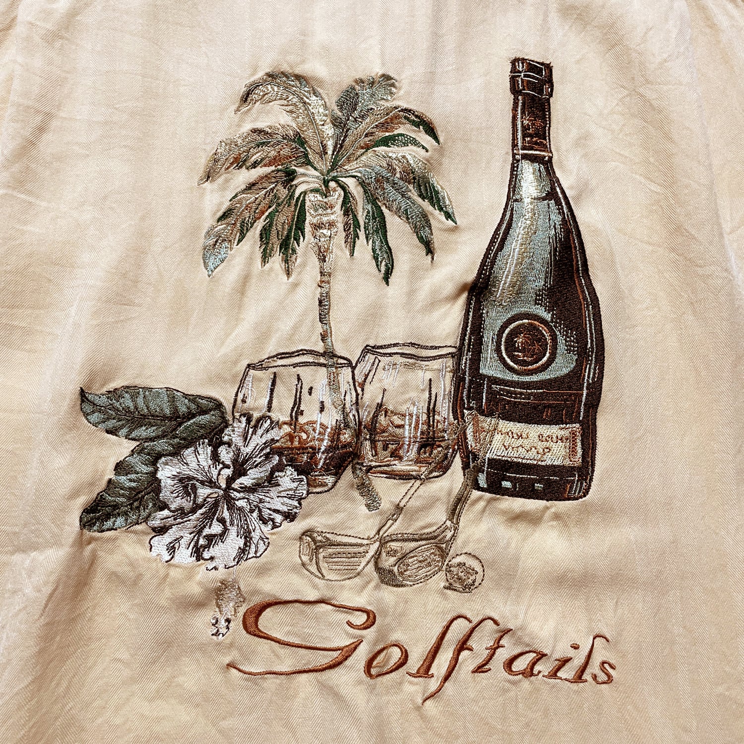 USA 古着 LUAU シルク 開襟 アロハシャツ ハワイアンシャツ GOLFTAILS ゴルフテイル 刺繍 ゴルフ メンズL 薄オレンジ系 BF3328