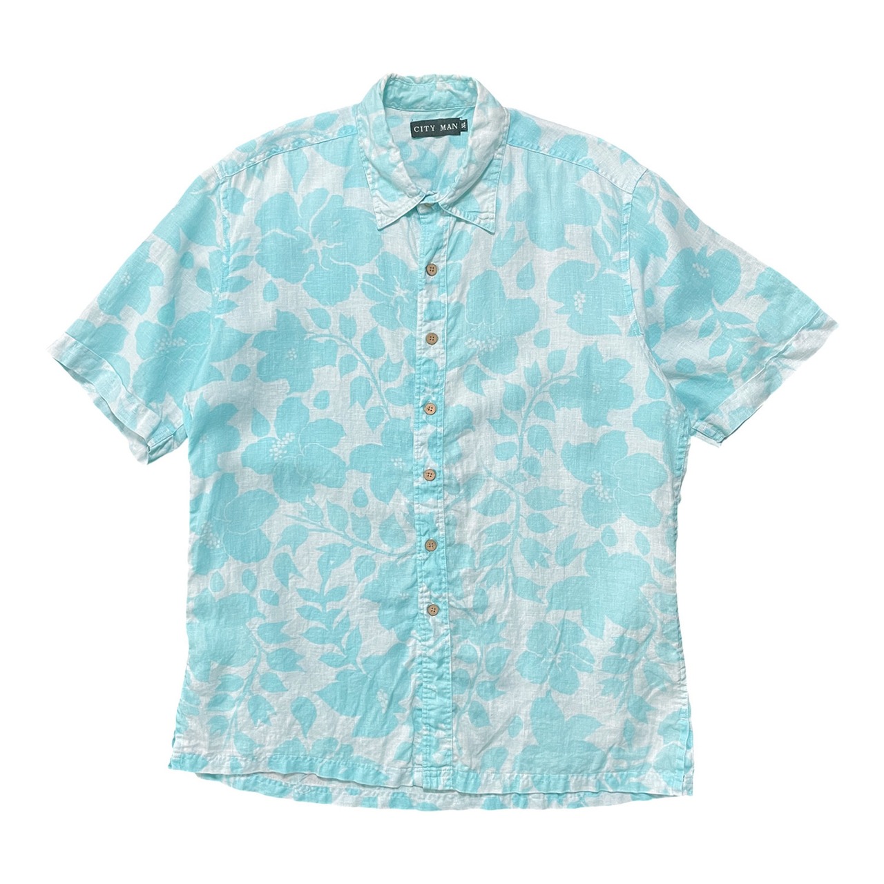 USA 古着 CITY MAN シティマン リネン/コットン アロハシャツ ハワイアンシャツ リーフ ハイビスカス柄 メンズXL ブルー系 BF3453