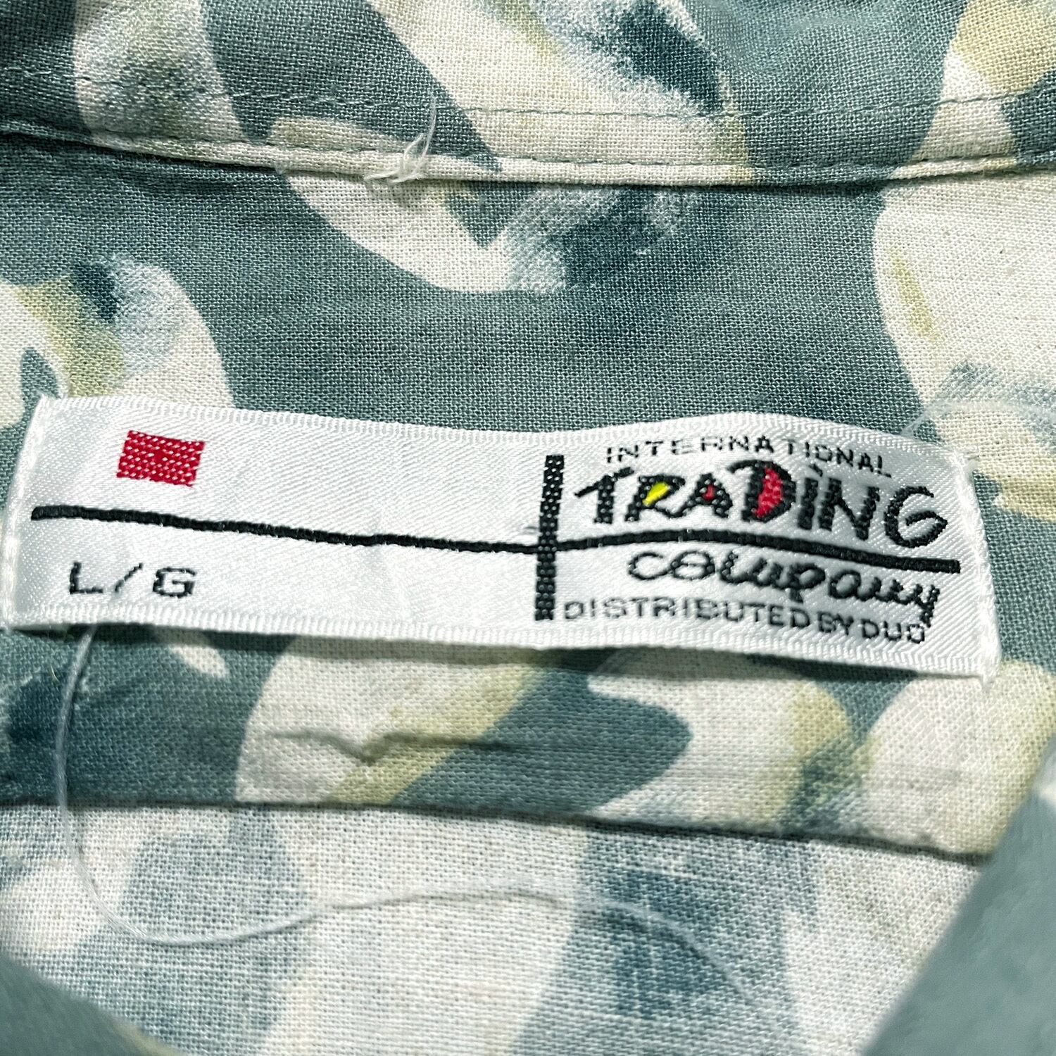 USA 古着 TRADING トレーディング ビスコース/リネン アロハシャツ ハワイアンシャツ 総柄 メンズL ブルー系 BF3457