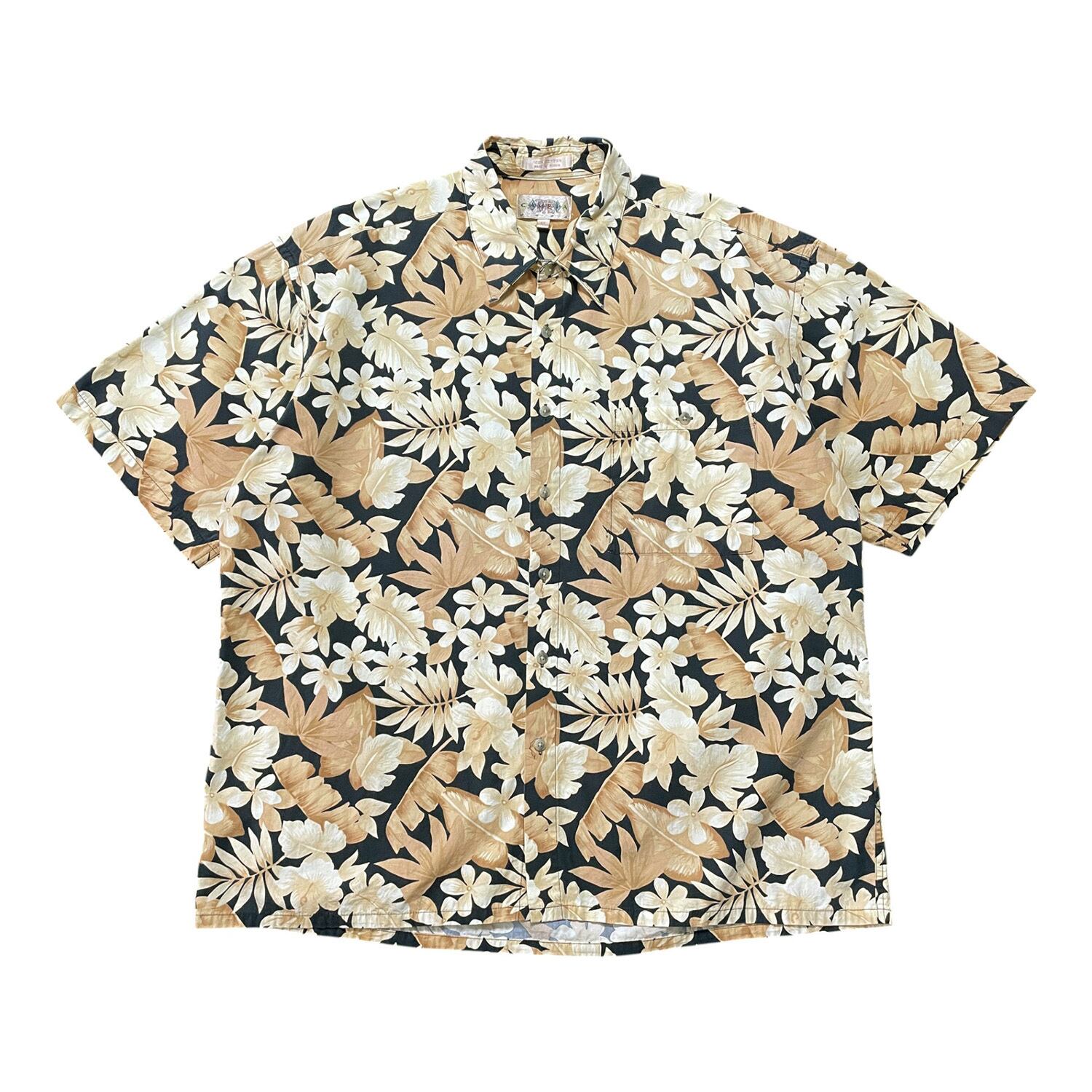 USA 古着 CAMPIA MODA カンピア モダ コットン アロハシャツ ハワイアンシャツ リーフ フラワー柄 メンズXL ブラック BF3458