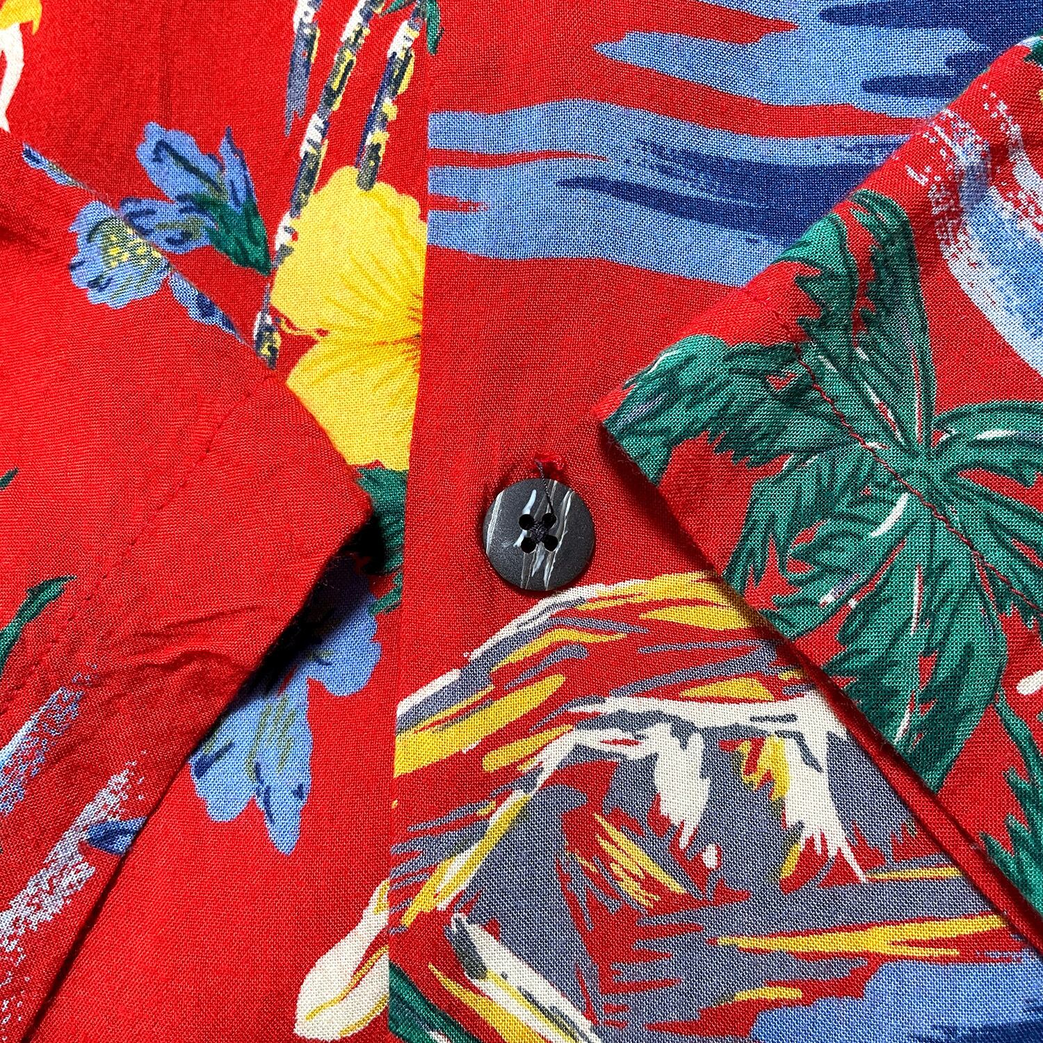 USA 古着 CHEROKEE チェロキー レーヨン 開襟 アロハシャツ ハワイアンシャツ フラガール ハイビスカス パームツリー柄 メンズXL BF3574