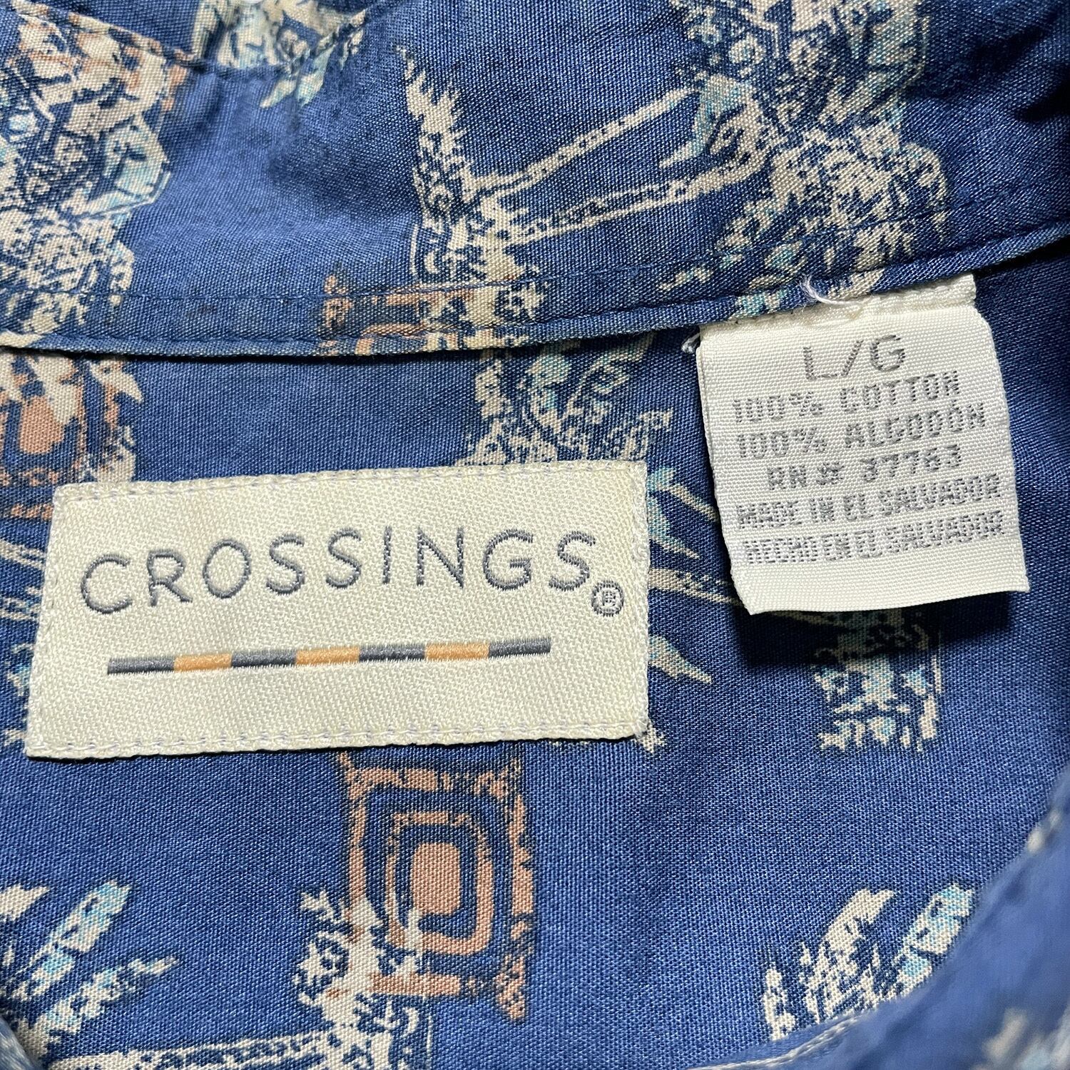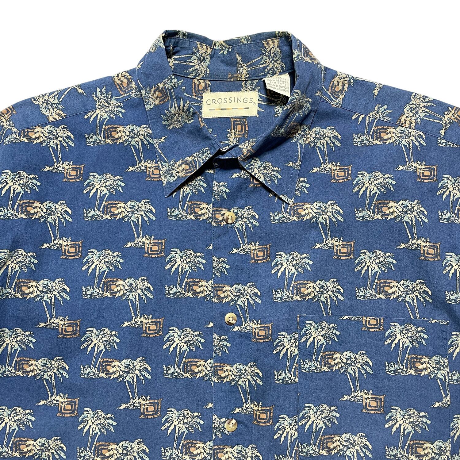 USA 古着 CROSSINGS クロッシング コットン アロハシャツ ハワイアンシャツ ネイビー系 パームツリー柄 メンズL BF3729