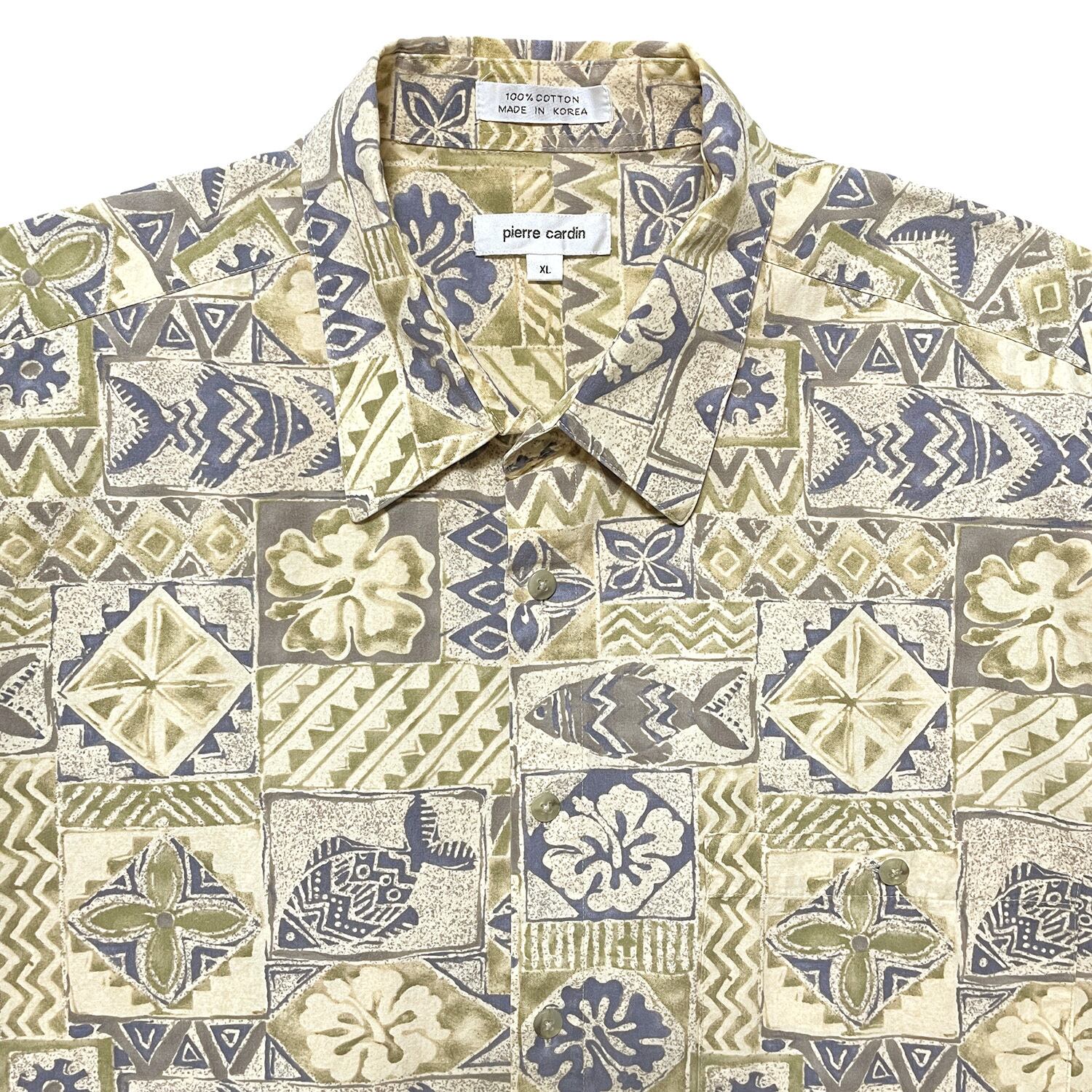 USA 古着 Pierre Cardin ピエールカルダン コットン アロハシャツ ハワイアンシャツ メンズXL ベージュ フィッシュ オリエンタル柄 BF3741