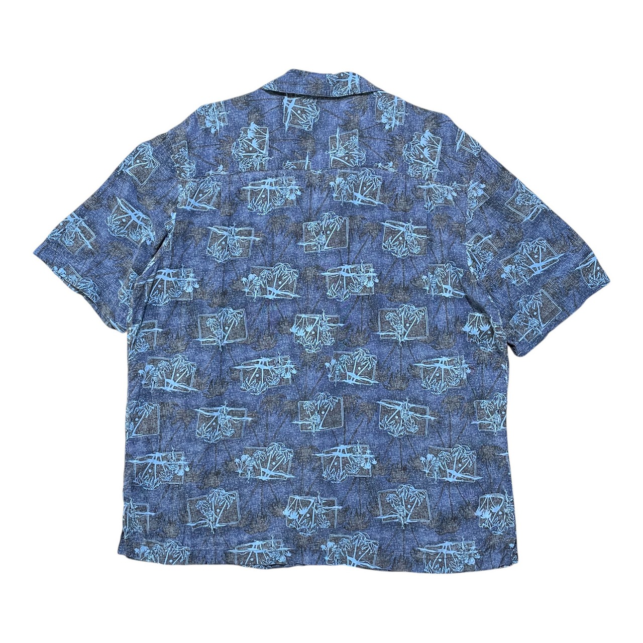 USA 古着 GEORGE ジョージ レーヨン 開襟 アロハシャツ ハワイアンシャツ パームツリー フラガール柄 メンズL ネイビー BF3688