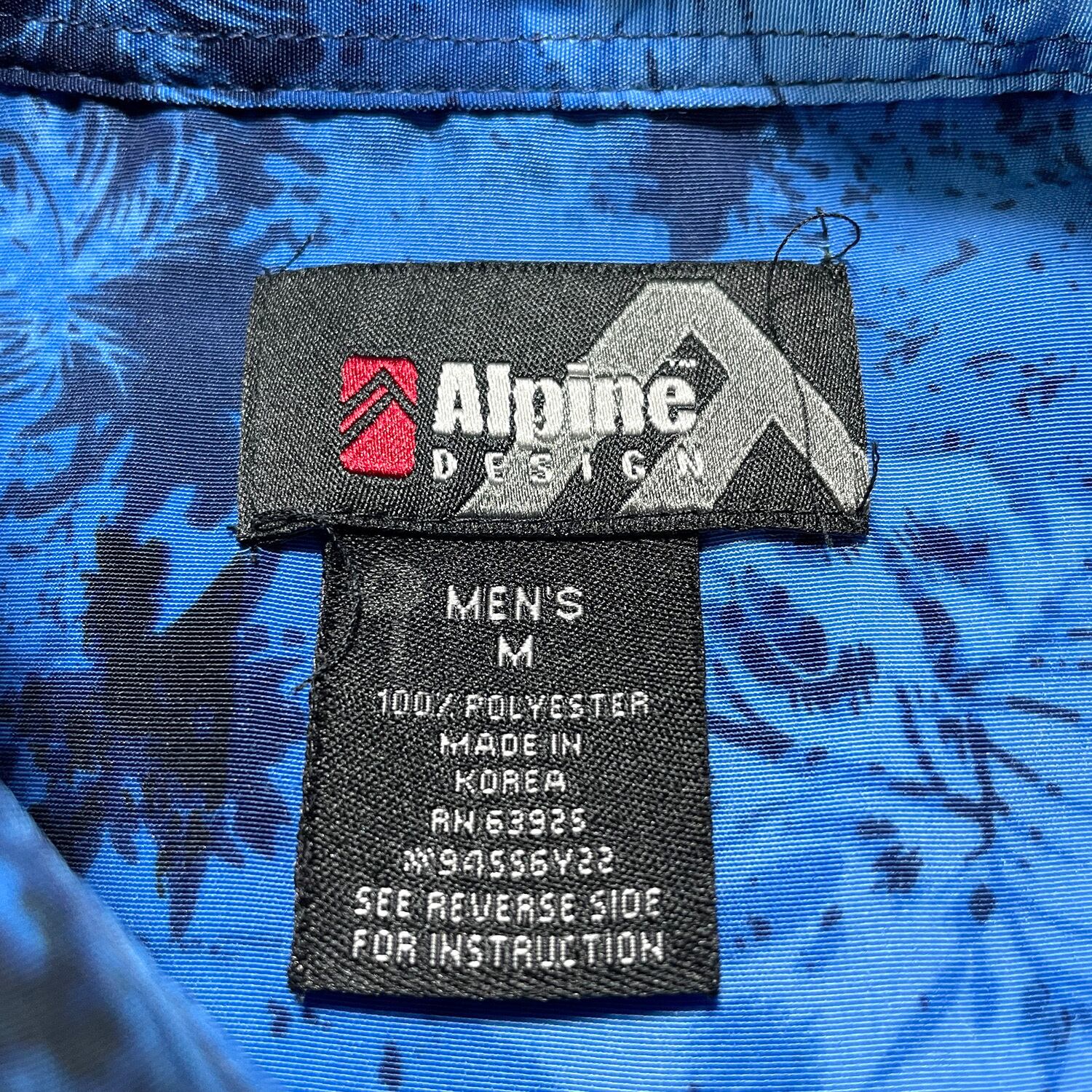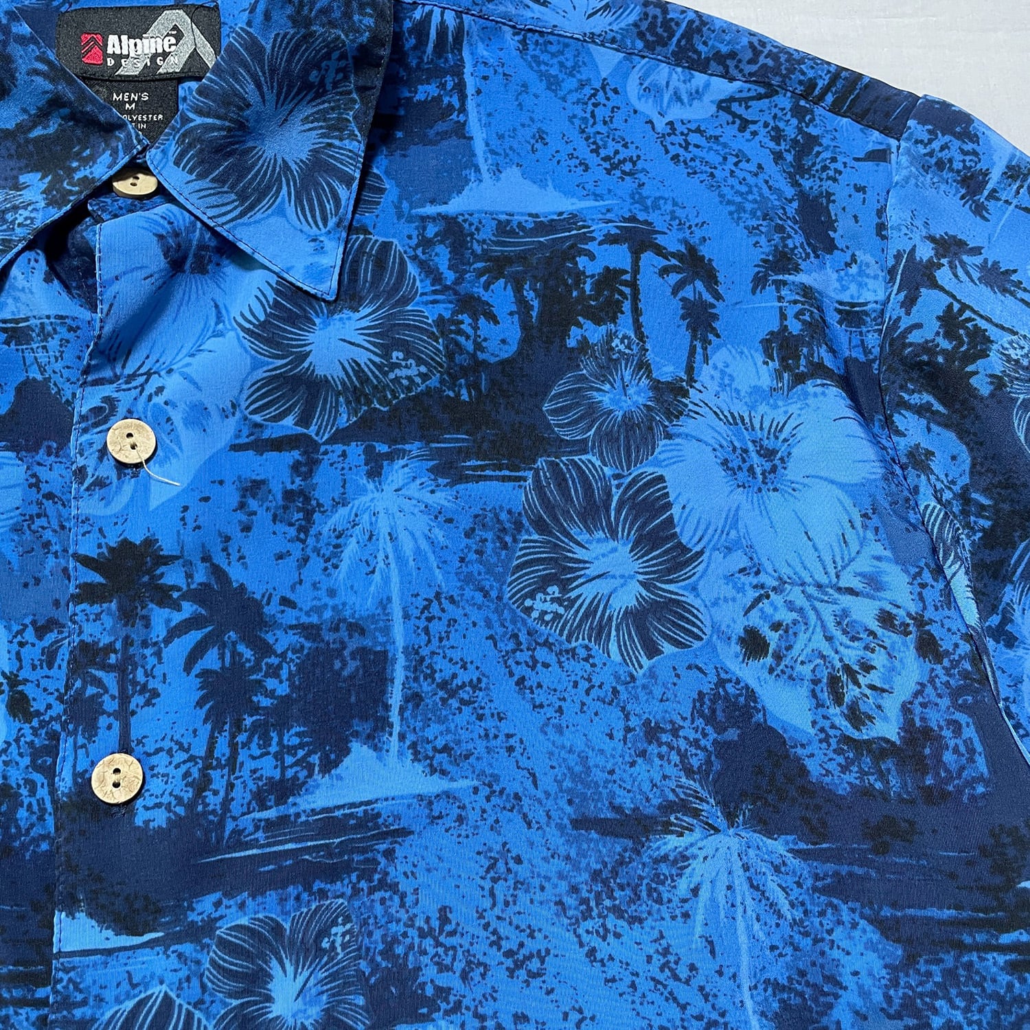 USA 古着 Alpaine DESIGN アルパインデザイン ポリエステル アロハシャツ ハワイアンシャツ パームツリー ハイビスカス 総柄 メンズM ブルー BF3692