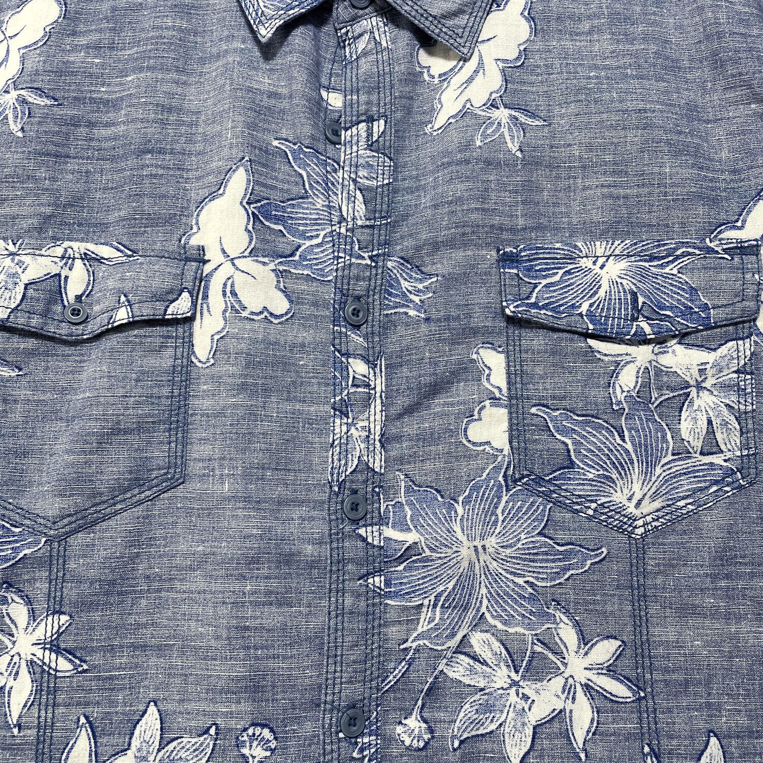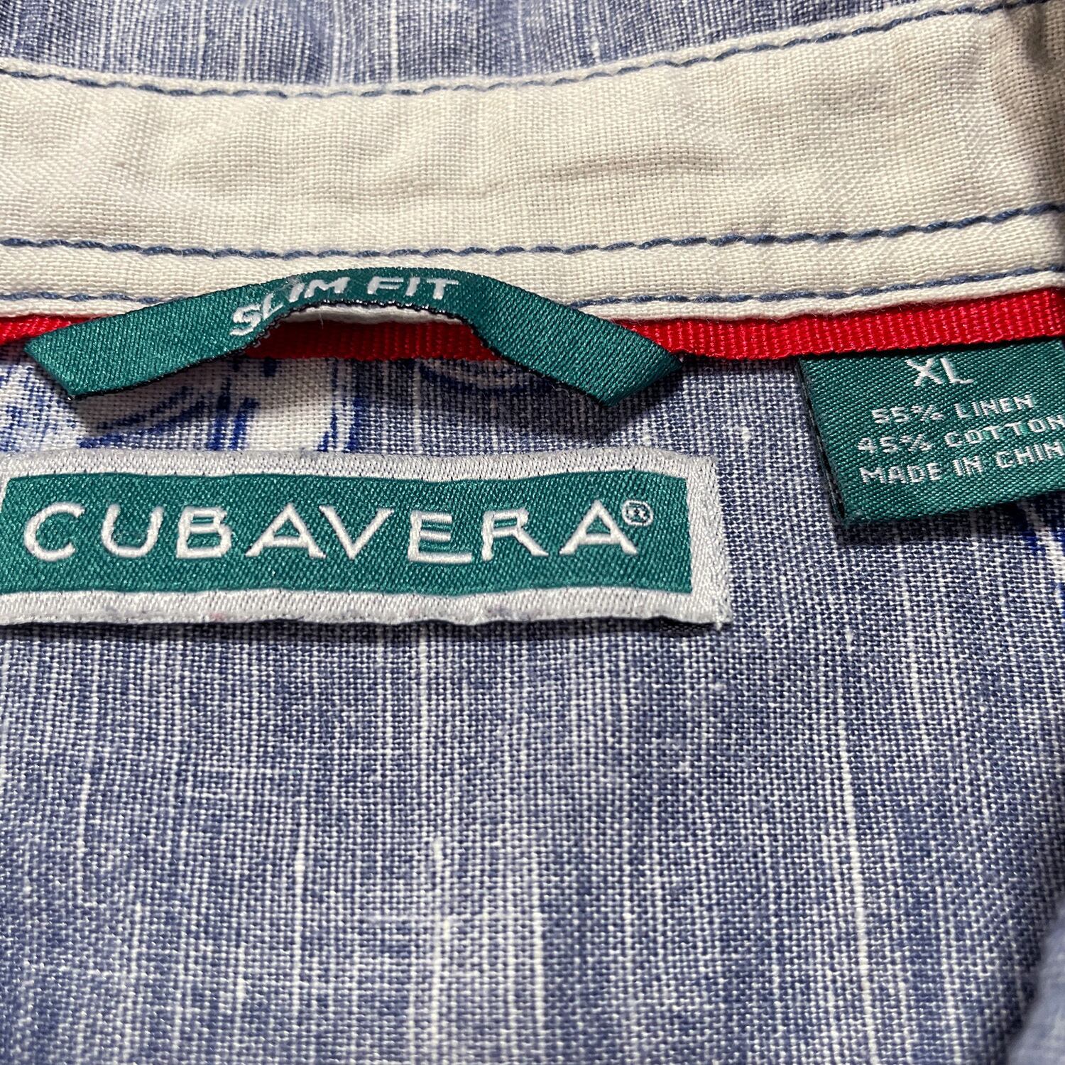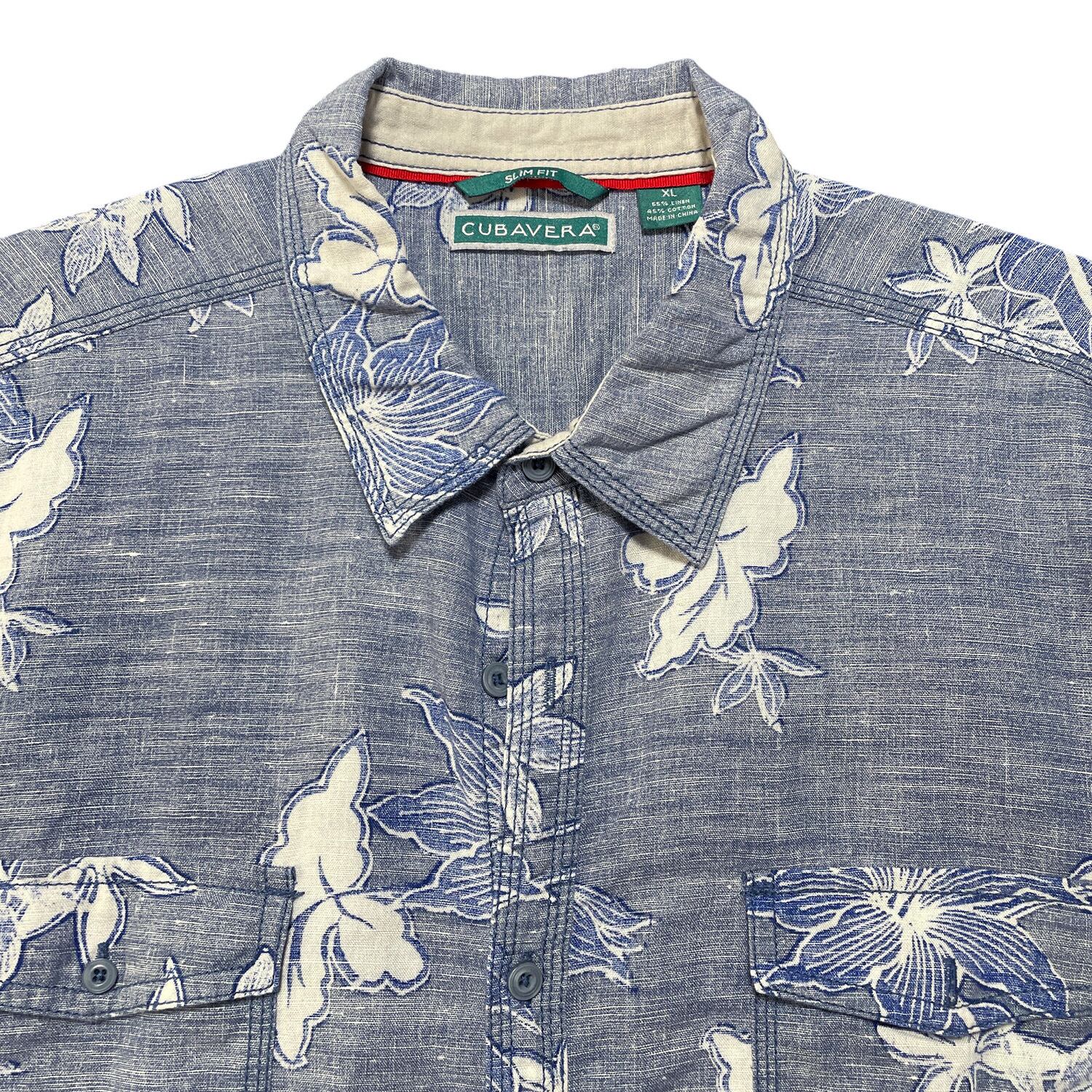 USA 古着 CUBAVERA キューバベラ リネン コットン アロハシャツ ハワイアンシャツ リーフ柄 メンズXL ネイビー BF3701