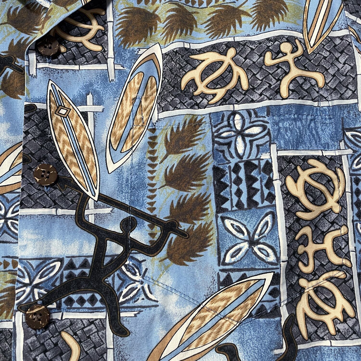 USA 古着 ハワイコレクション コットン 開襟 アロハシャツ ハワイアンシャツ サーフボード ウミガメ ブルー メンズS BF3762