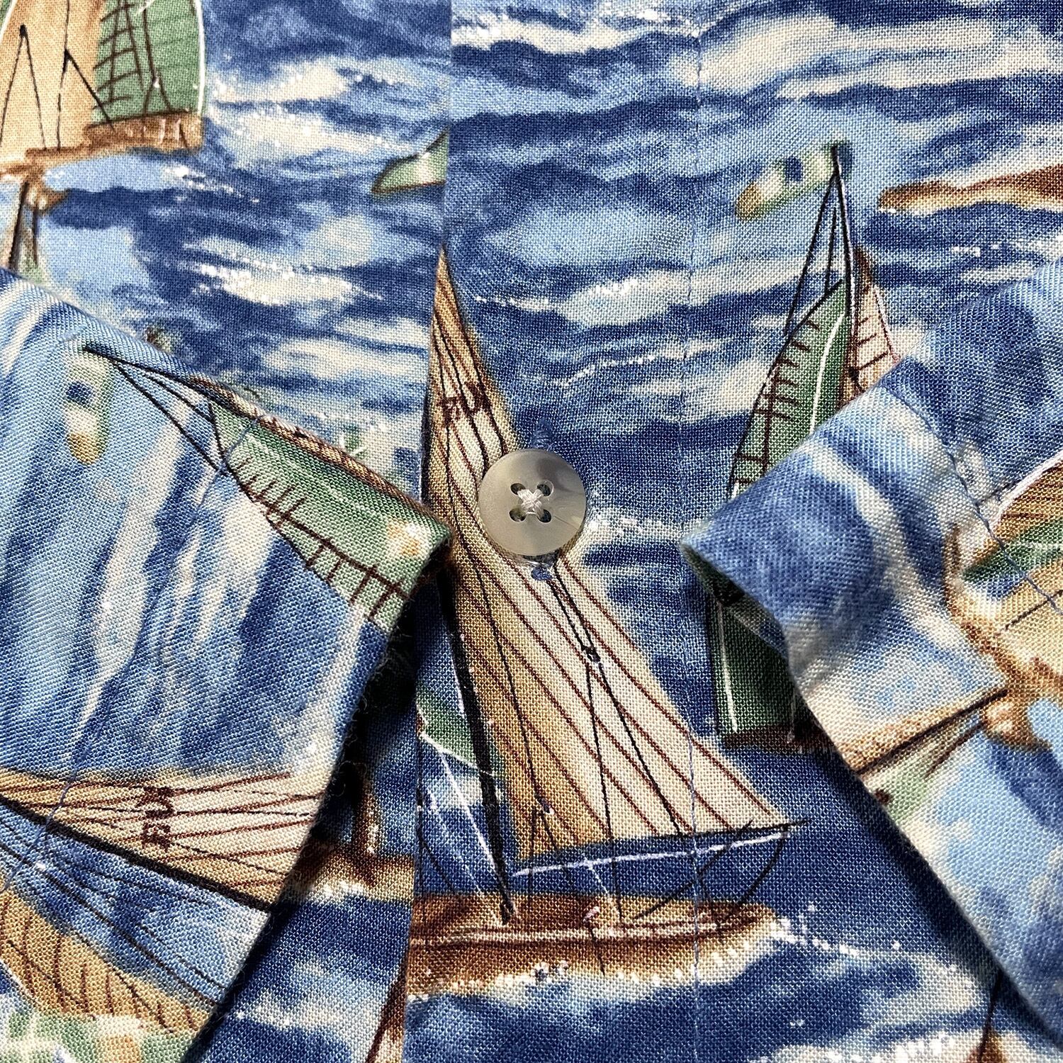USA 古着 HARF MOON BAY ハーフムーンベイ レーヨン アロハシャツ ハワイアンシャツ ヨット 総柄 メンズL ブルー BF3802