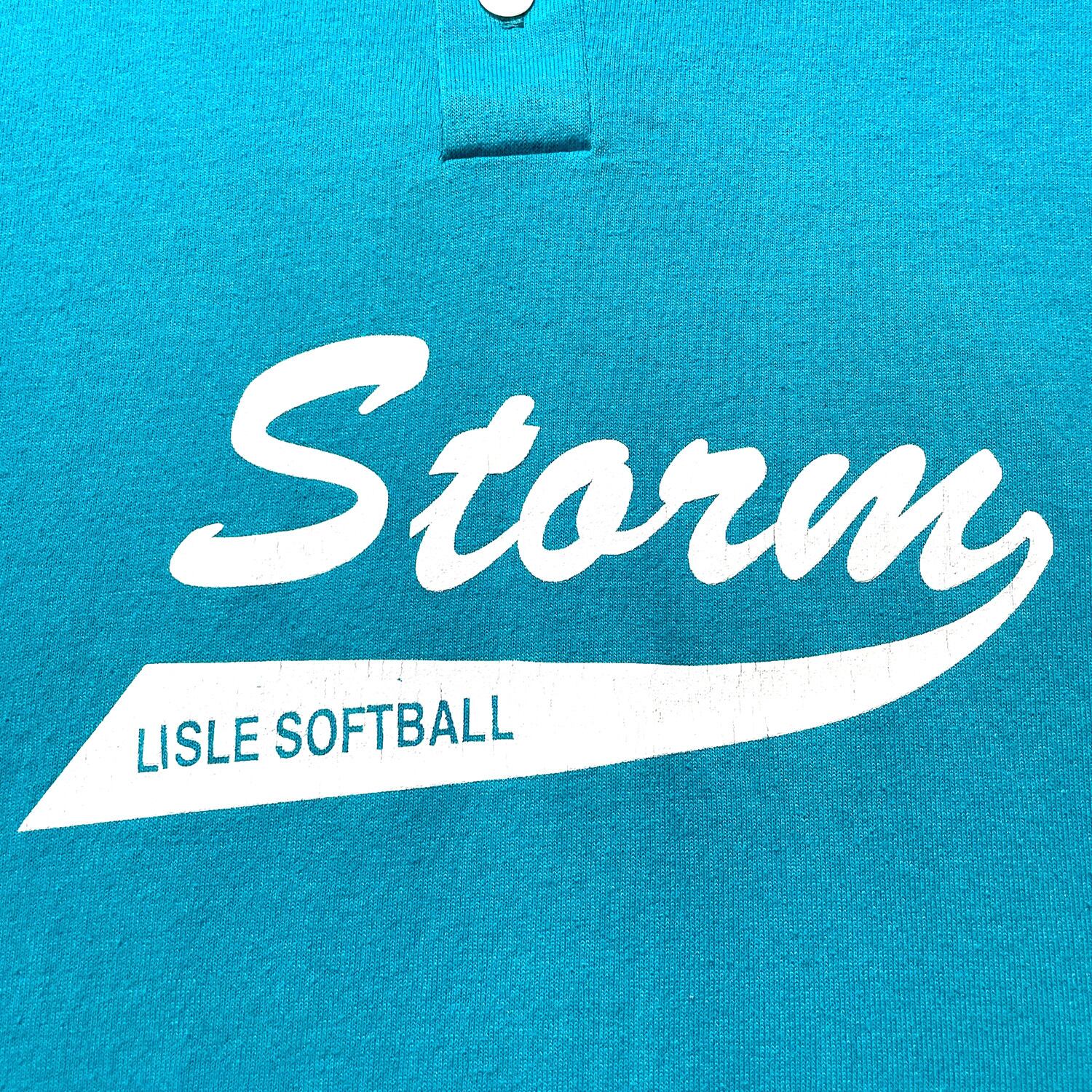 古着 USA製 90S Tシャツ ヴィンテージ プリント ブルー メンズL ヘンリーネック BA4380