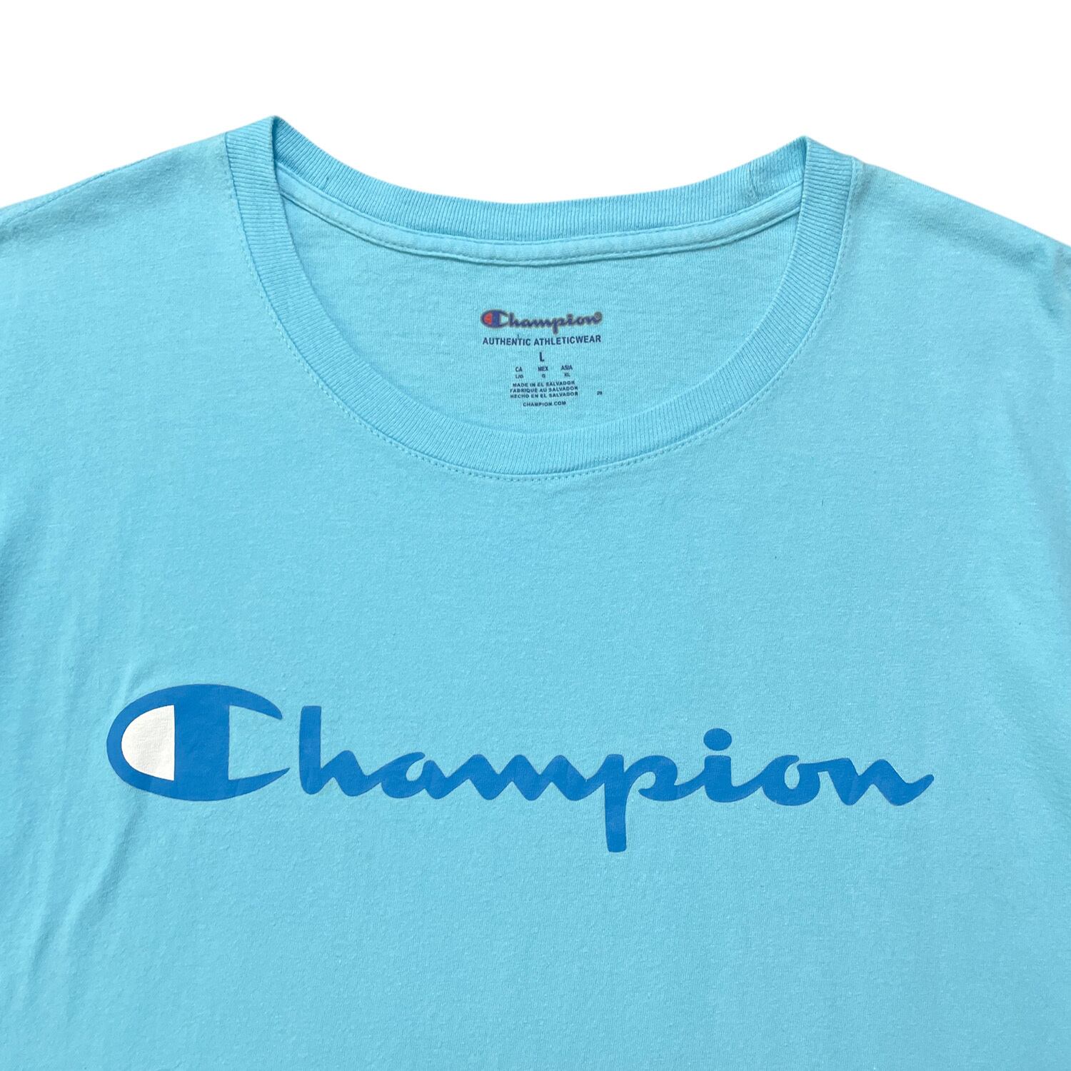USA 古着 Champion チャンピオン Tシャツ ロゴ プリント ライトブルー メンズL クルーネック BA4586
