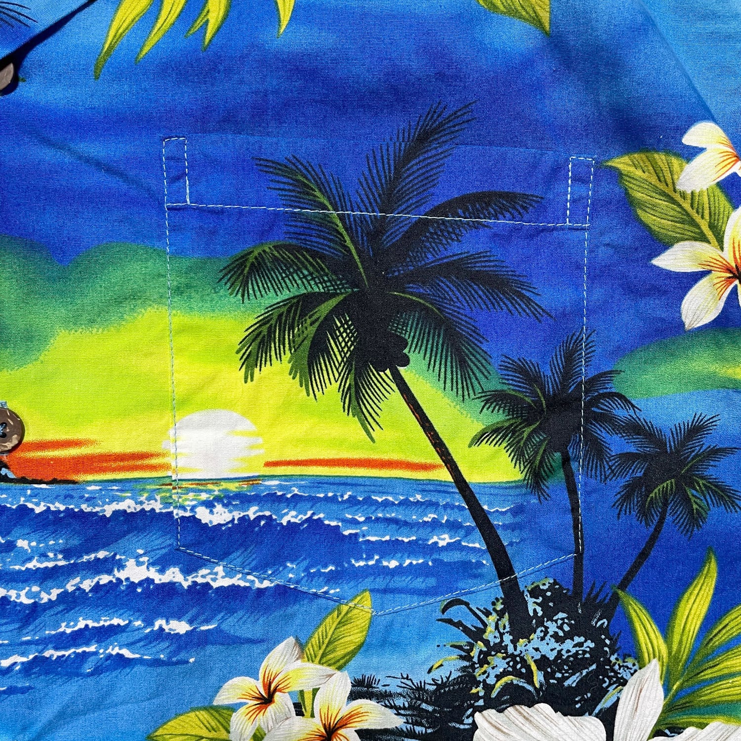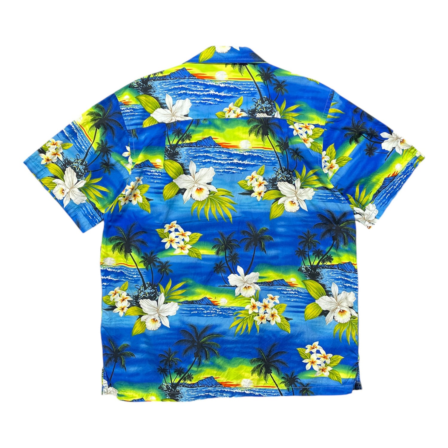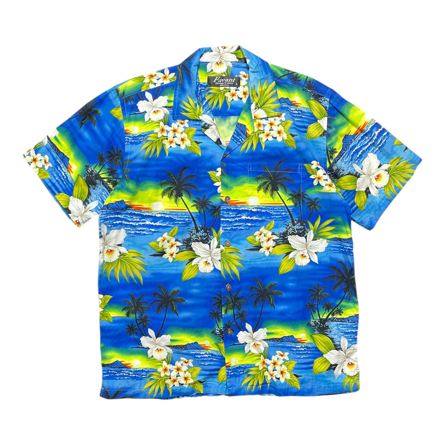USA 古着 Favant ファバント コットン アロハシャツ ハワイアンシャツ 開襟 プルメリア ビーチ サンセット柄 メンズL ブルー BF3846