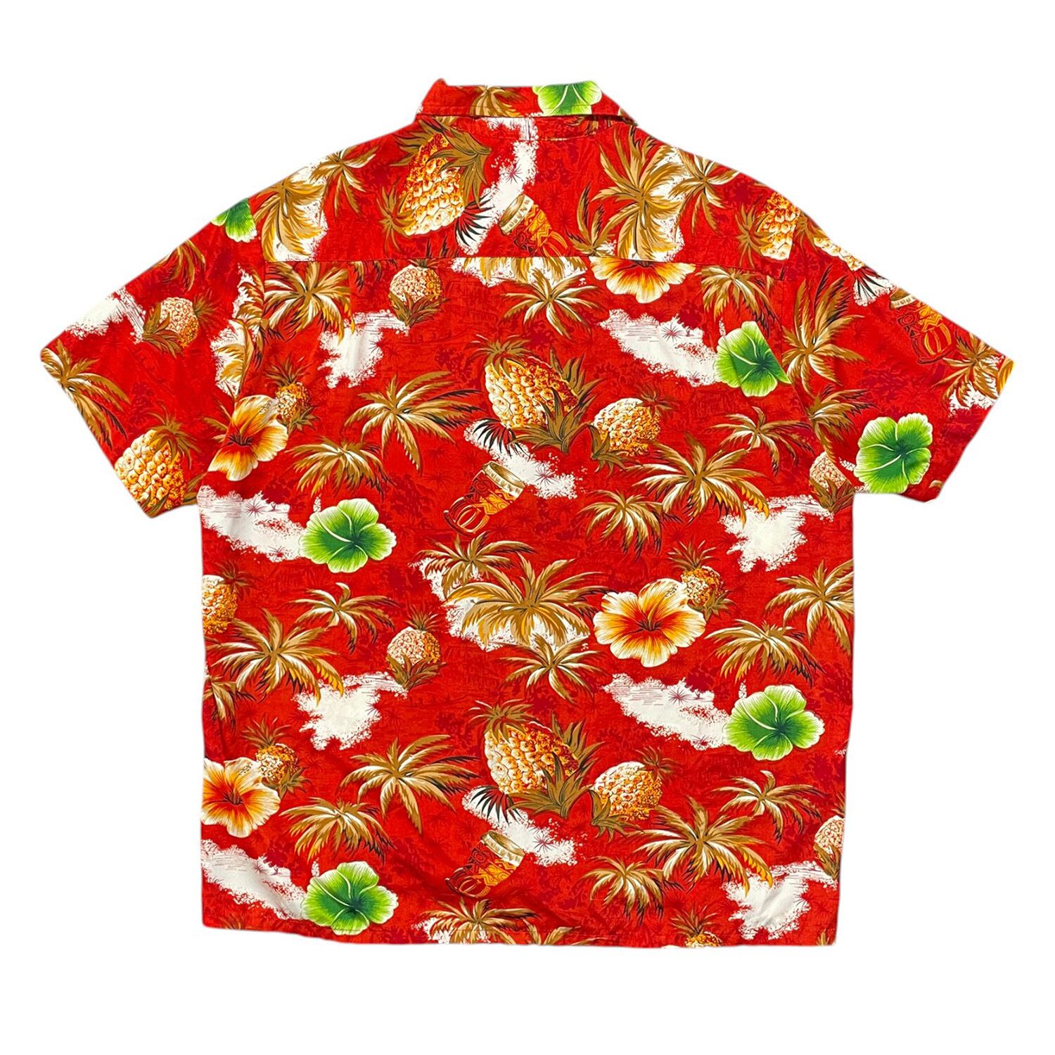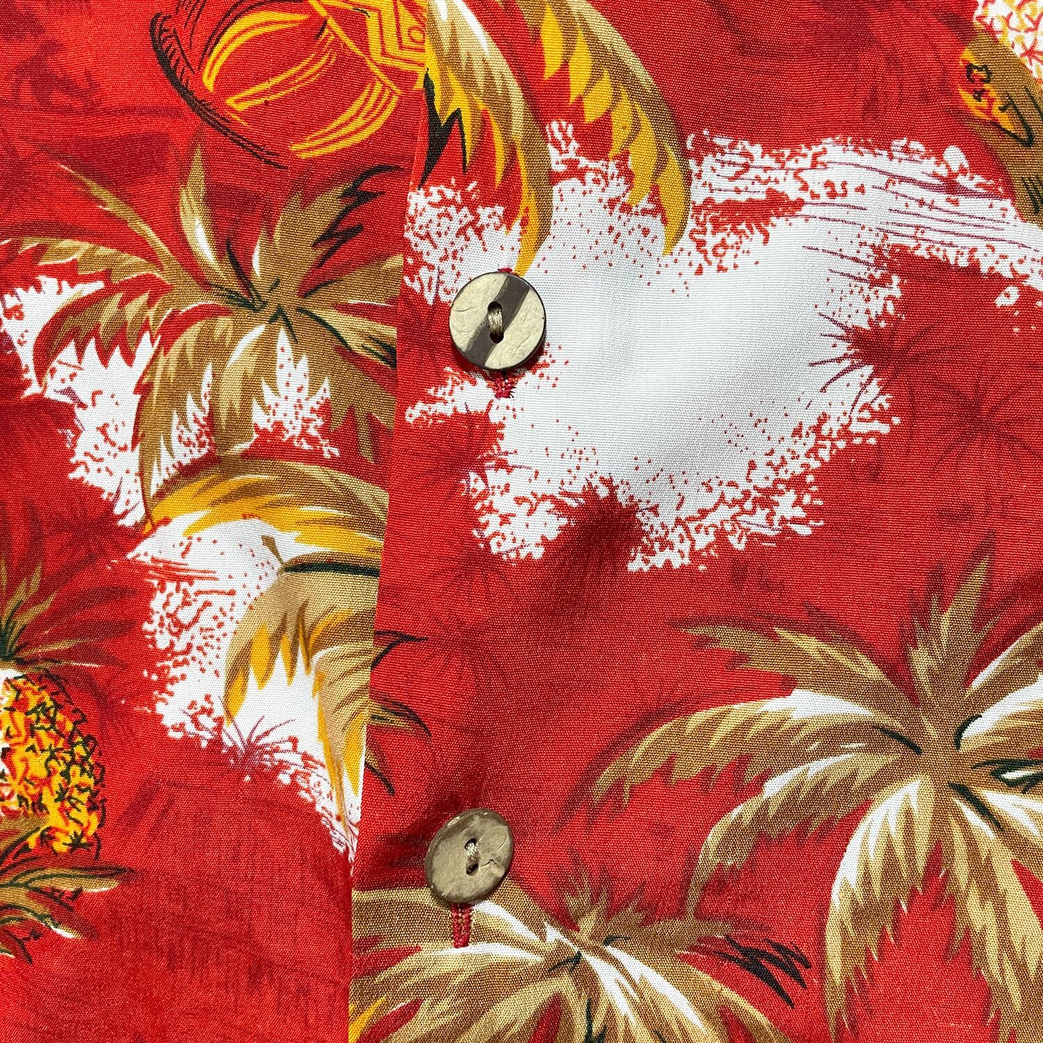 USA 古着 KENNINGTON ケニントン ポリエステル アロハシャツ ハワイアンシャツ 開襟 ハイビスカス パイナップル パームツリー柄 メンズXL レッド BF3849