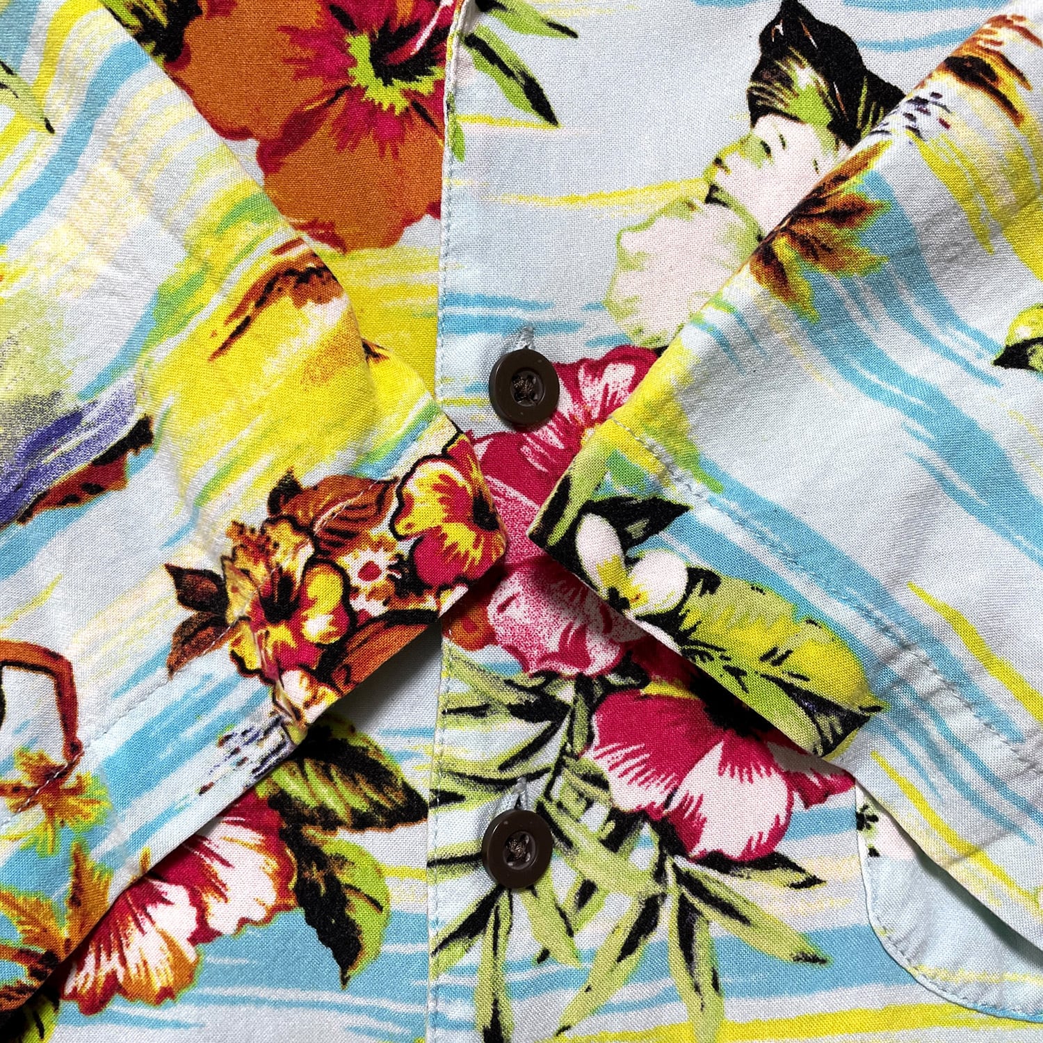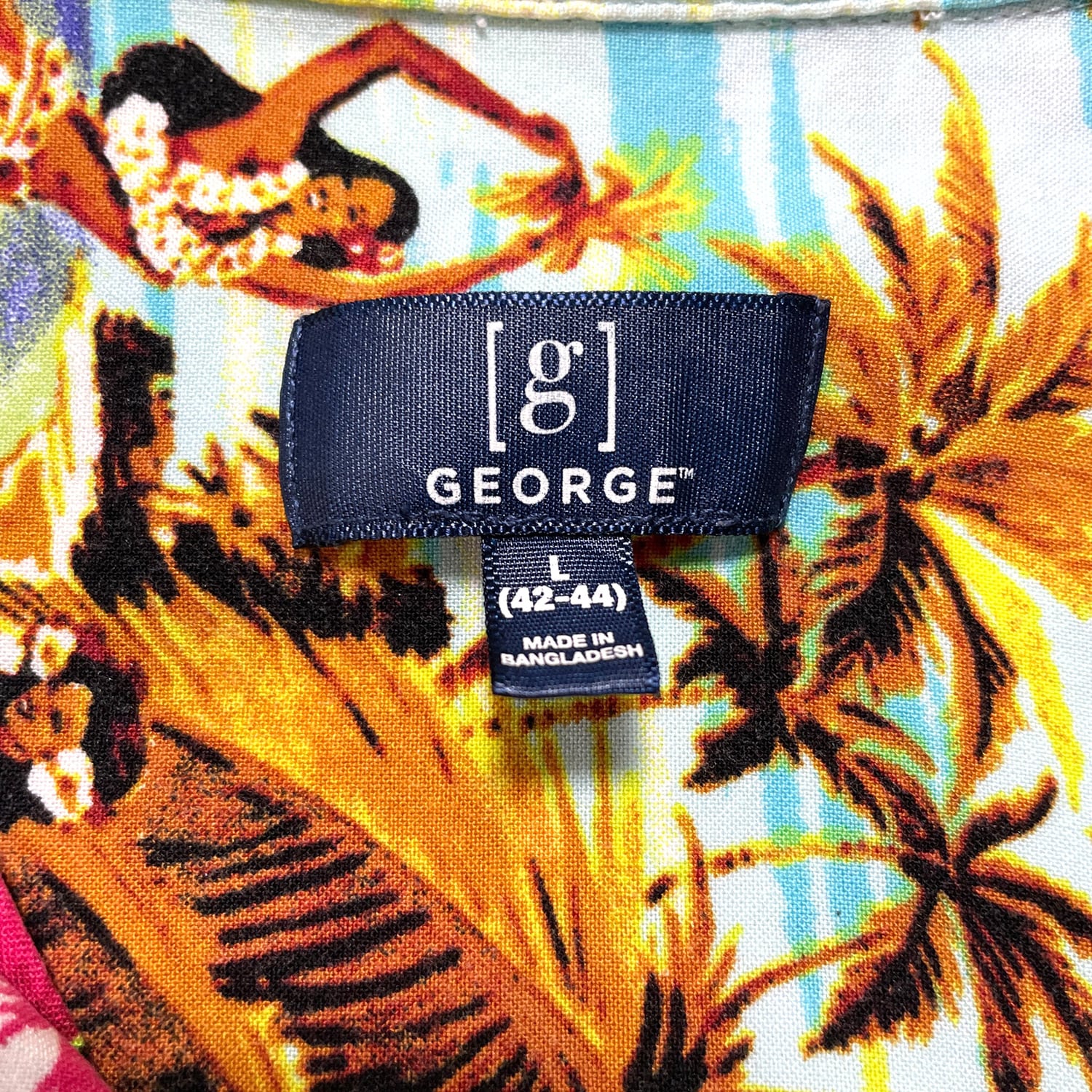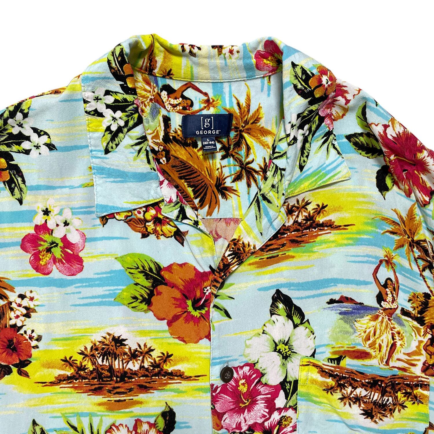 USA 古着 GEORGE ジョージ コットン アロハシャツ ハワイアンシャツ 開襟 フラガール ハイビスカス パームツリー柄 メンズL BF3850