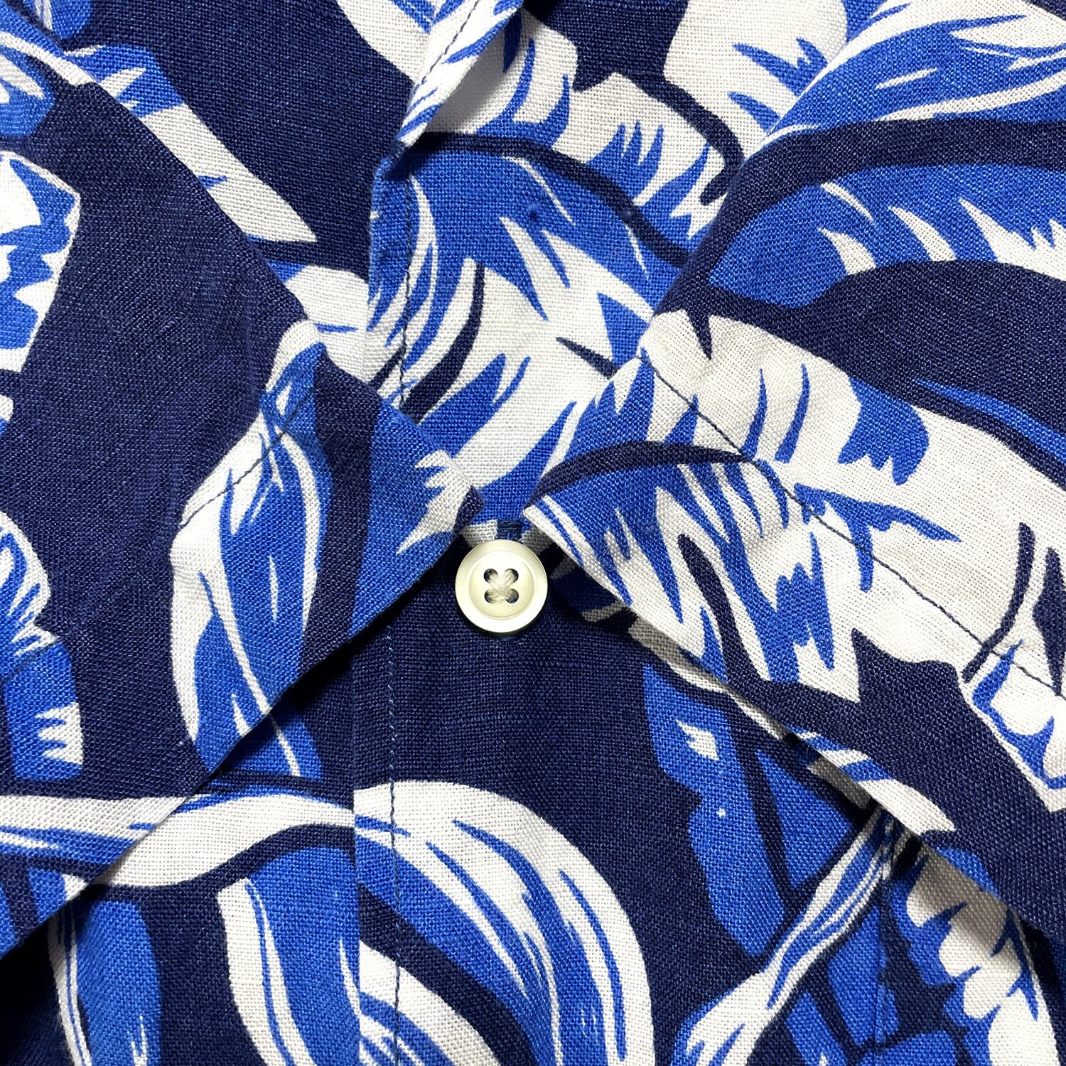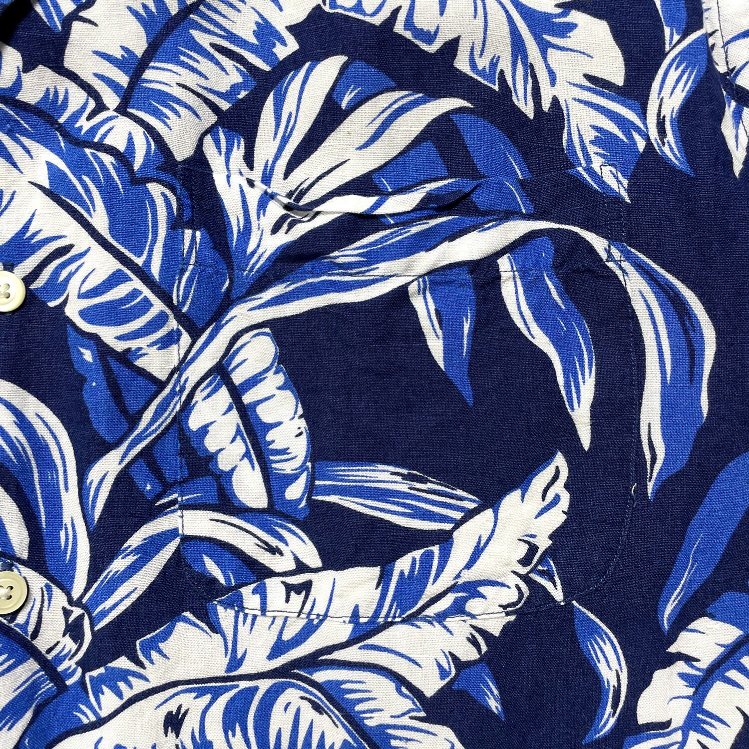 USA 古着 NAUTICA ノーティカ リネン/レーヨン 開襟 アロハシャツ ハワイアンシャツ メンズM ネイビー リーフ柄 BF3853
