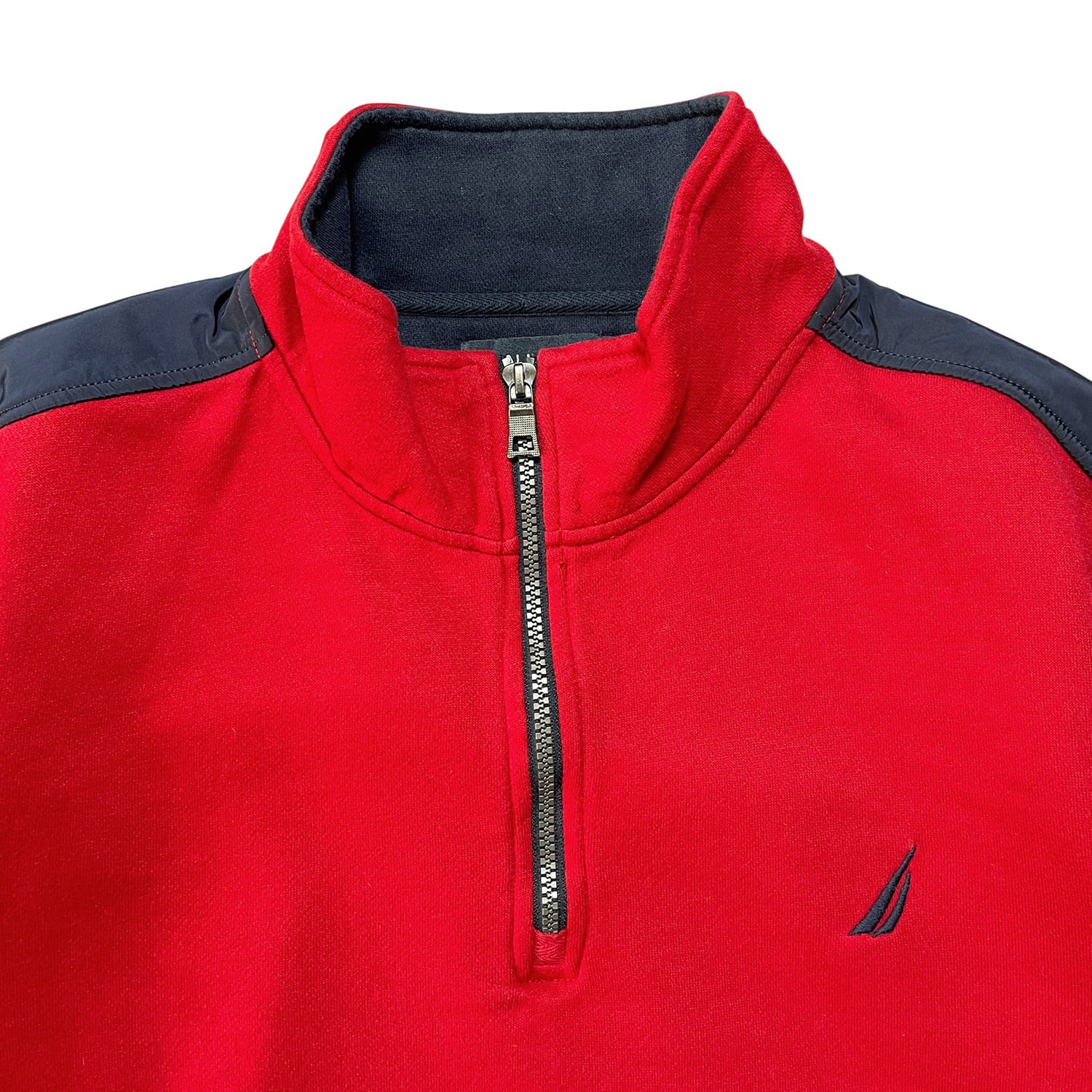USA 古着 NAUTICA ノーティカ スウェット トレーナー ロゴ 刺繍 切替 レッド メンズL ハーフジップ BD2722