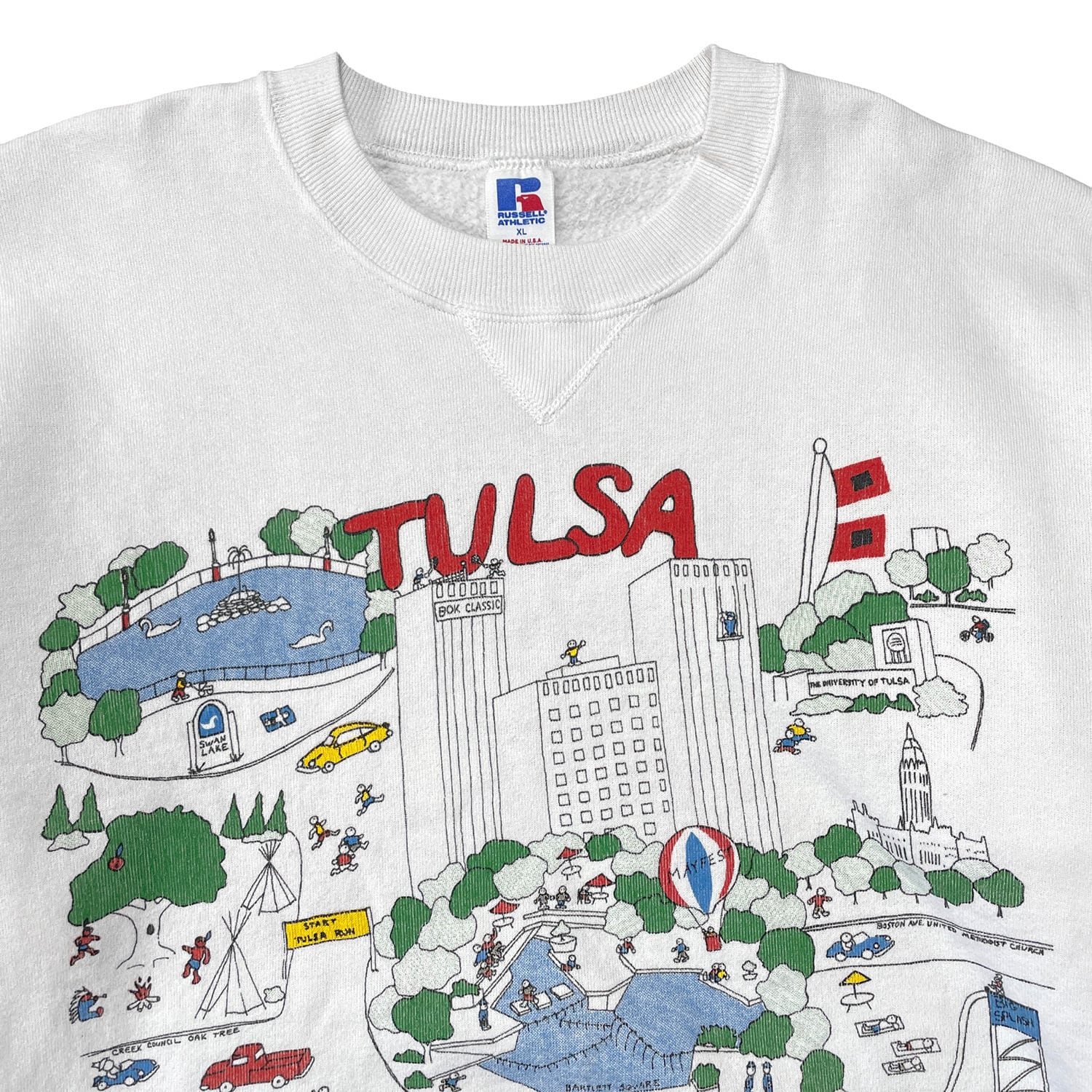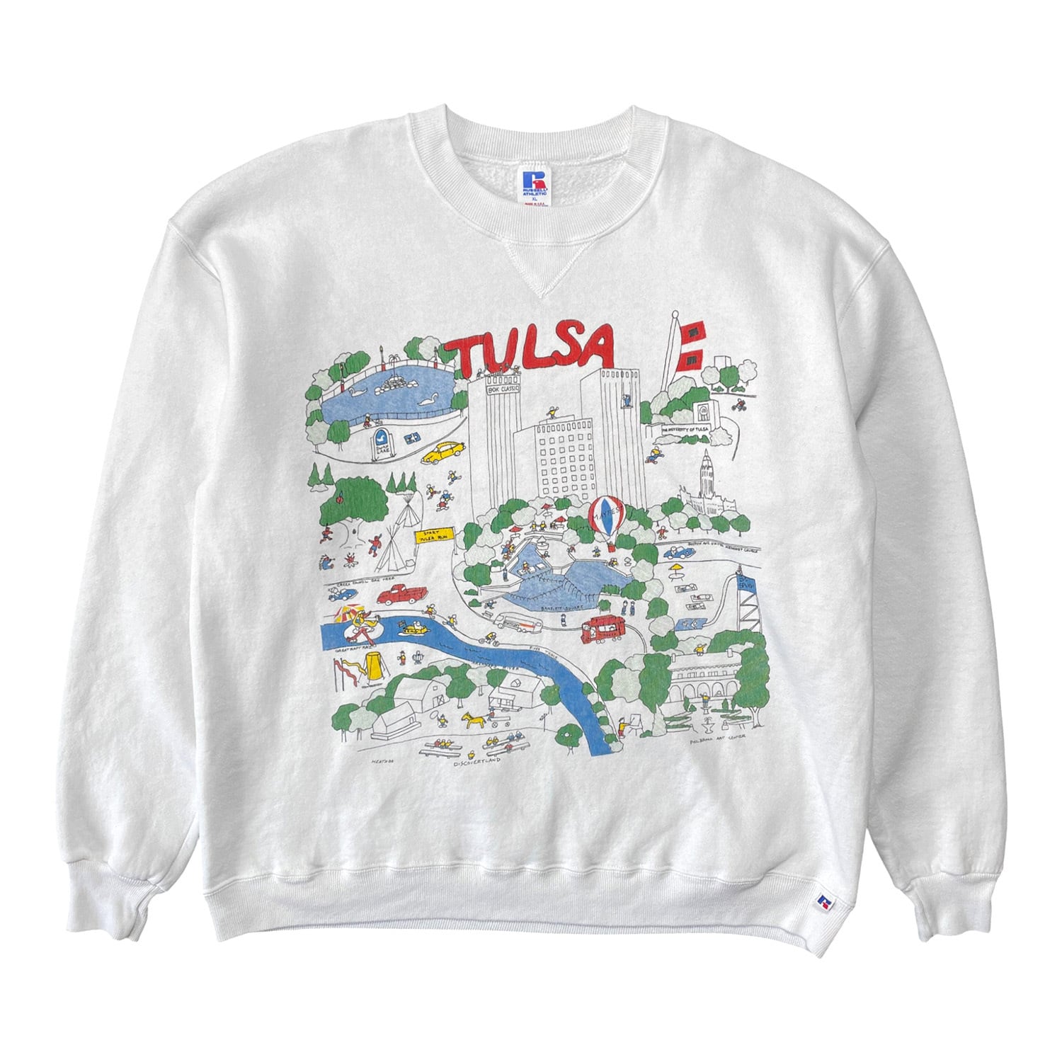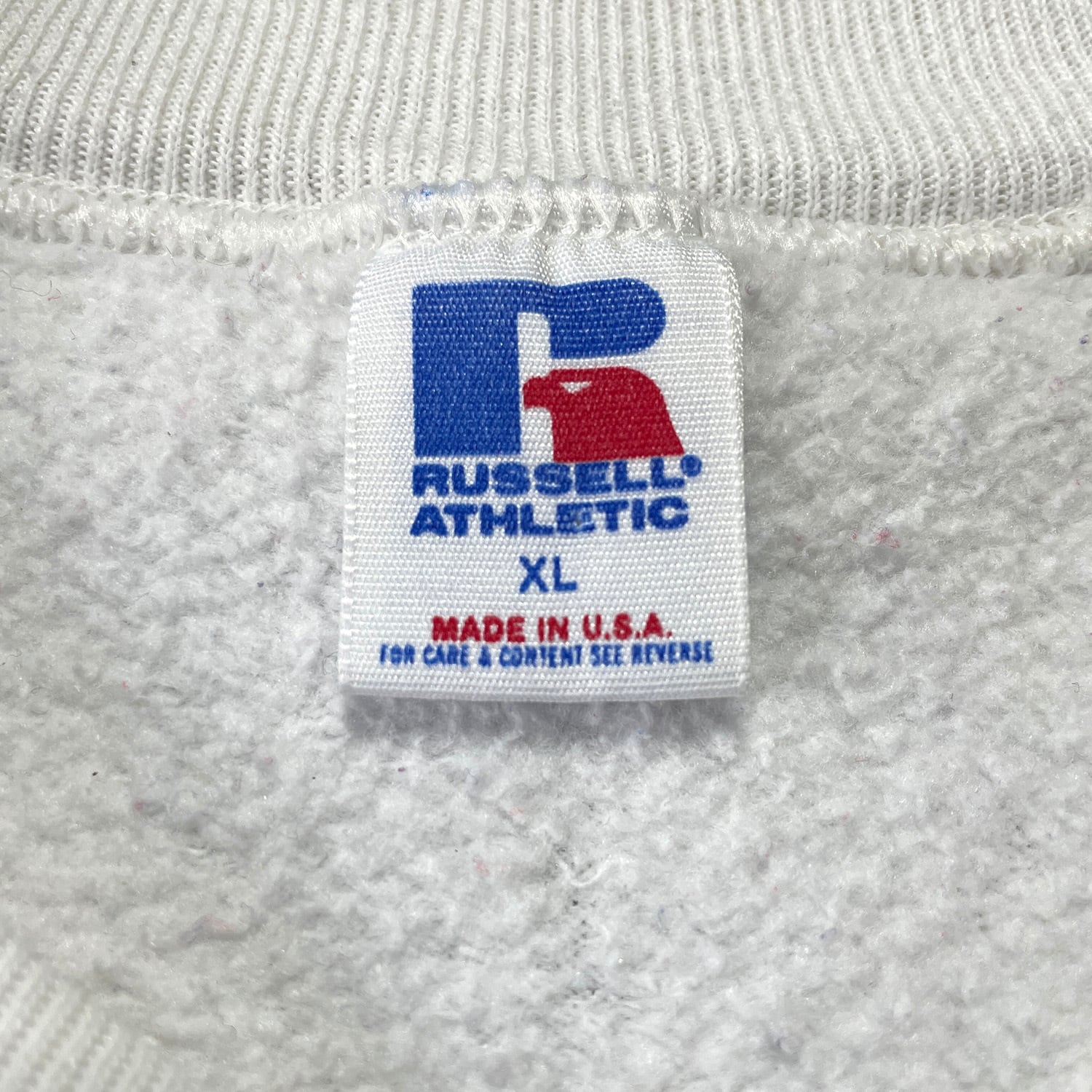 古着 USA製 90S Russell ラッセル ヴィンテージ 前V スウェット トレーナー プリント ホワイト メンズXL クルーネック BD2741