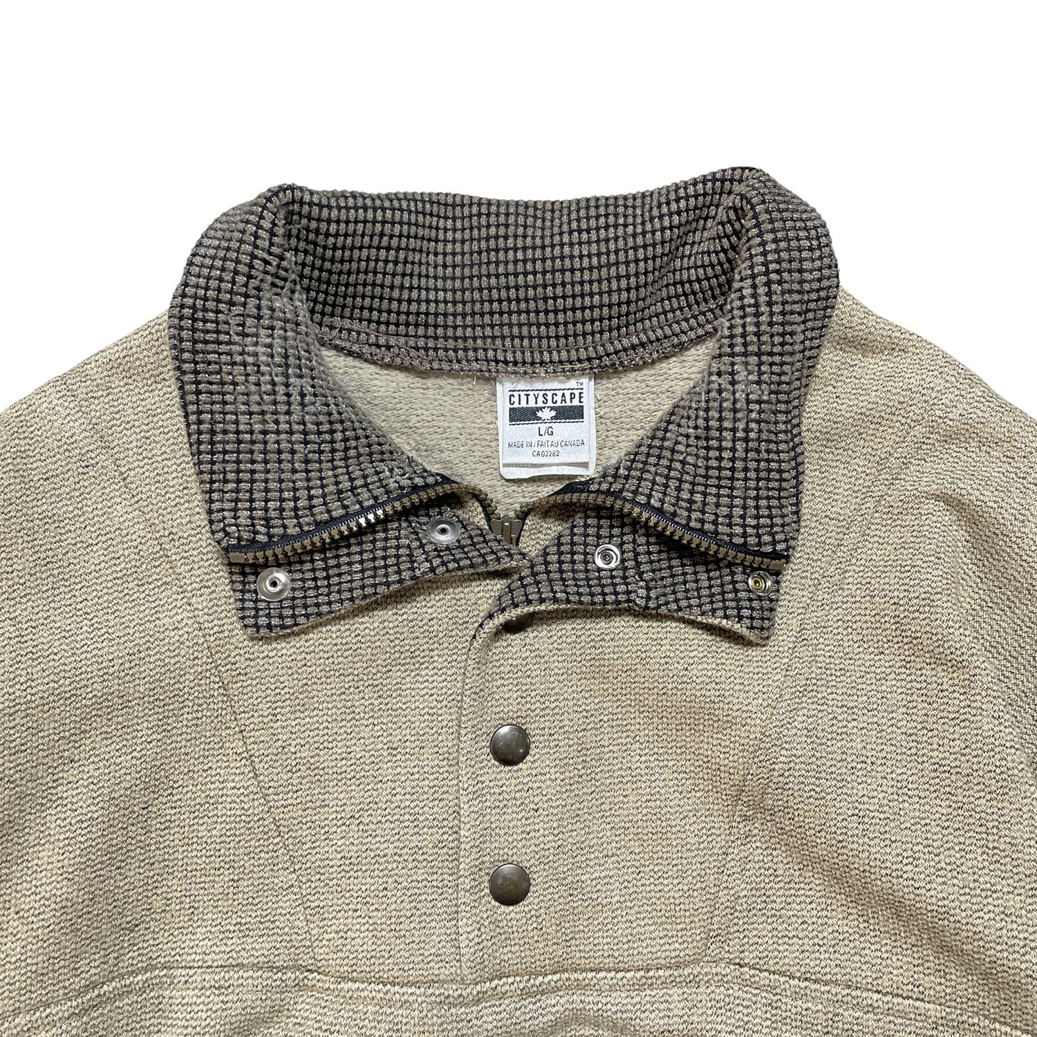 古着 90S カナダ製 ヴィンテージ スウェット トレーナー 刺繍 ハーフジップ ハーフボタン ベージュ メンズL BD2791