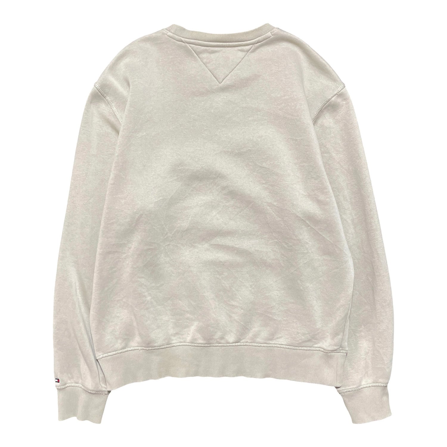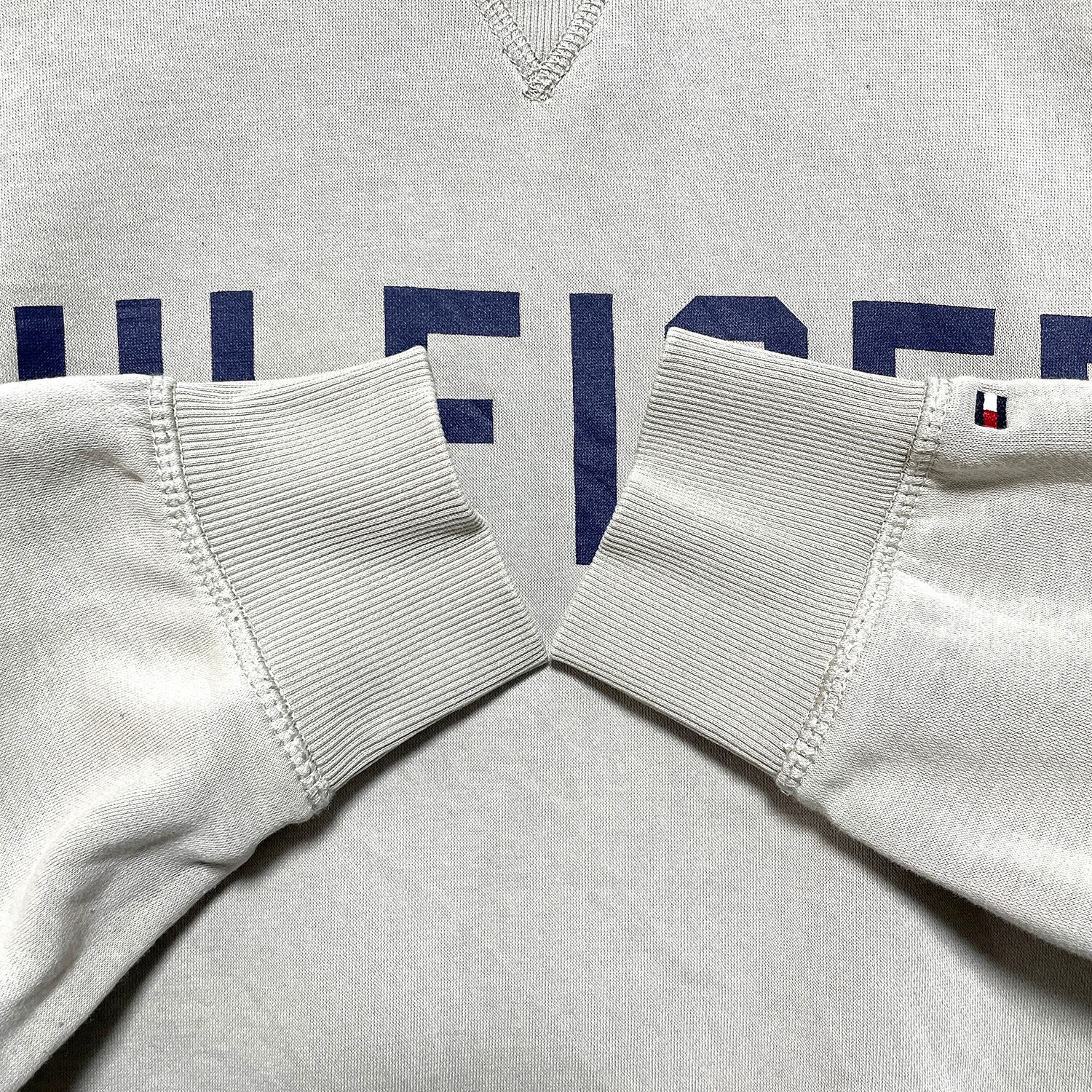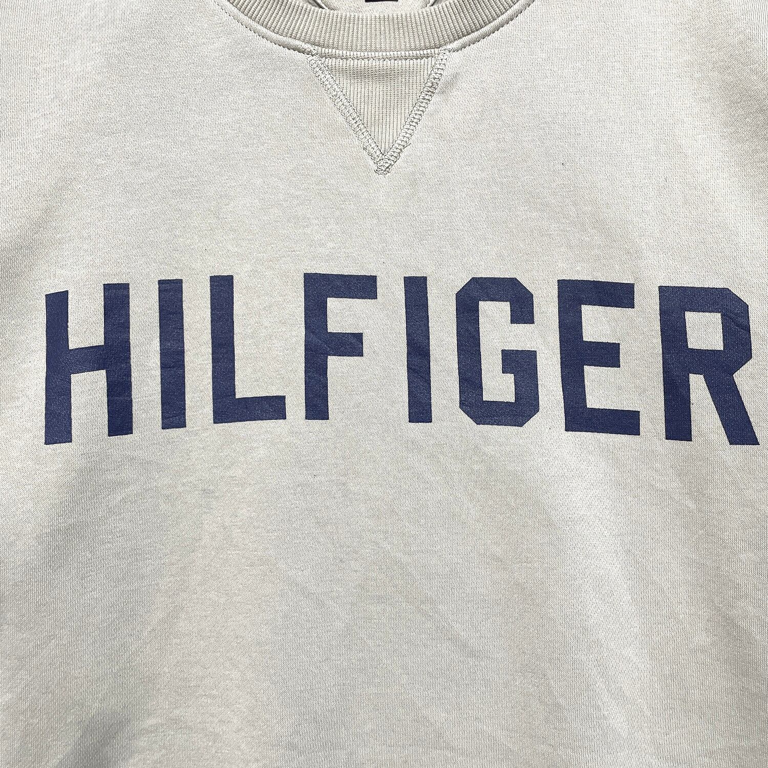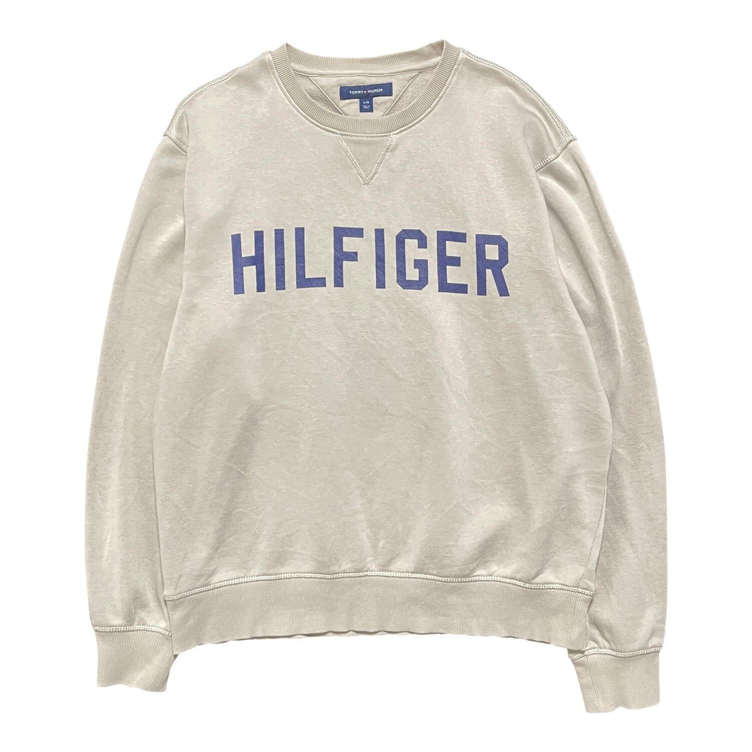 USA 古着 TOMMY HILFIGER トミーヒルフィガー 前V スウェット トレーナー ロゴ プリント ベージュ メンズL クルーネック BD2789<