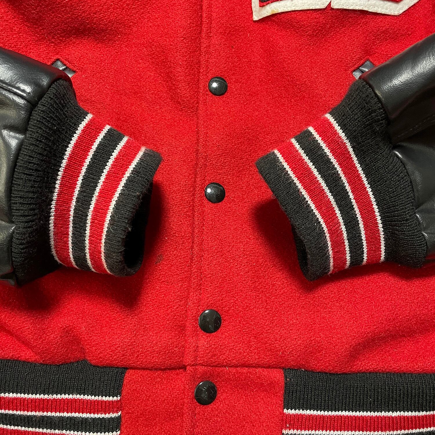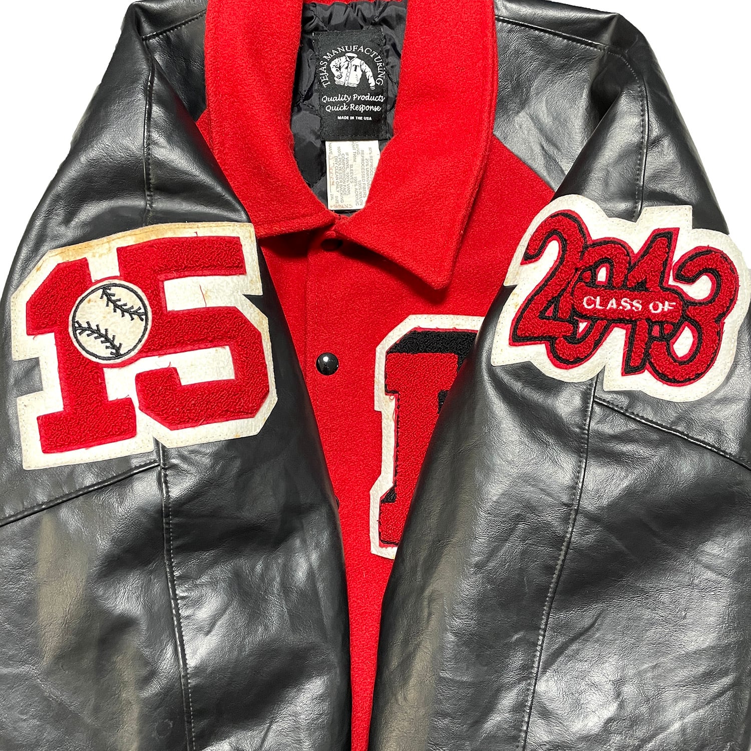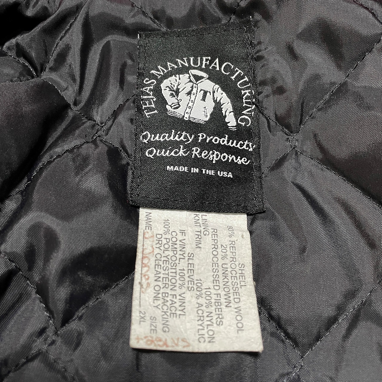 USA 古着 USA製 TEJAS MANUFACTURING ヴィンテージ レタード 袖革 合皮 スタジャン スタジアムジャケット メンズ2XL AK0316