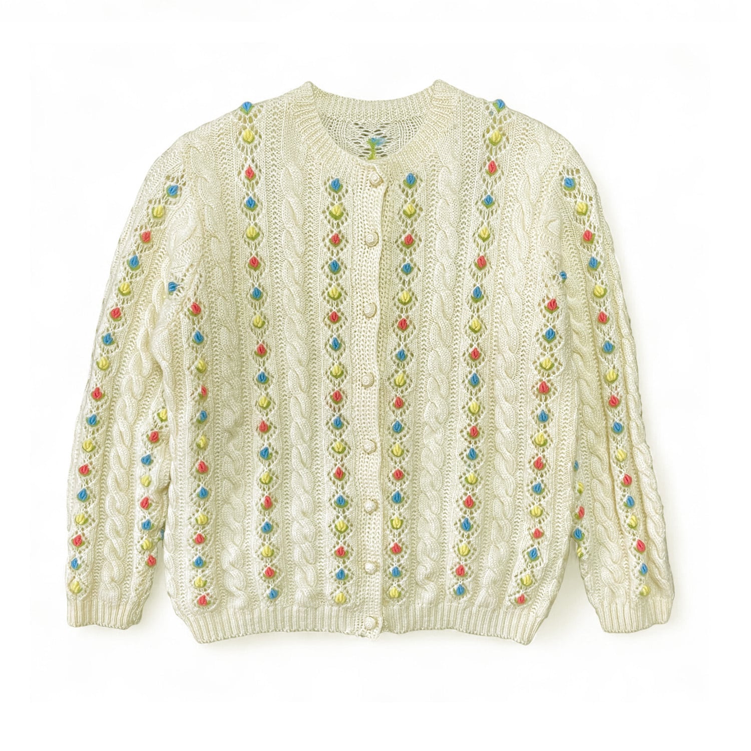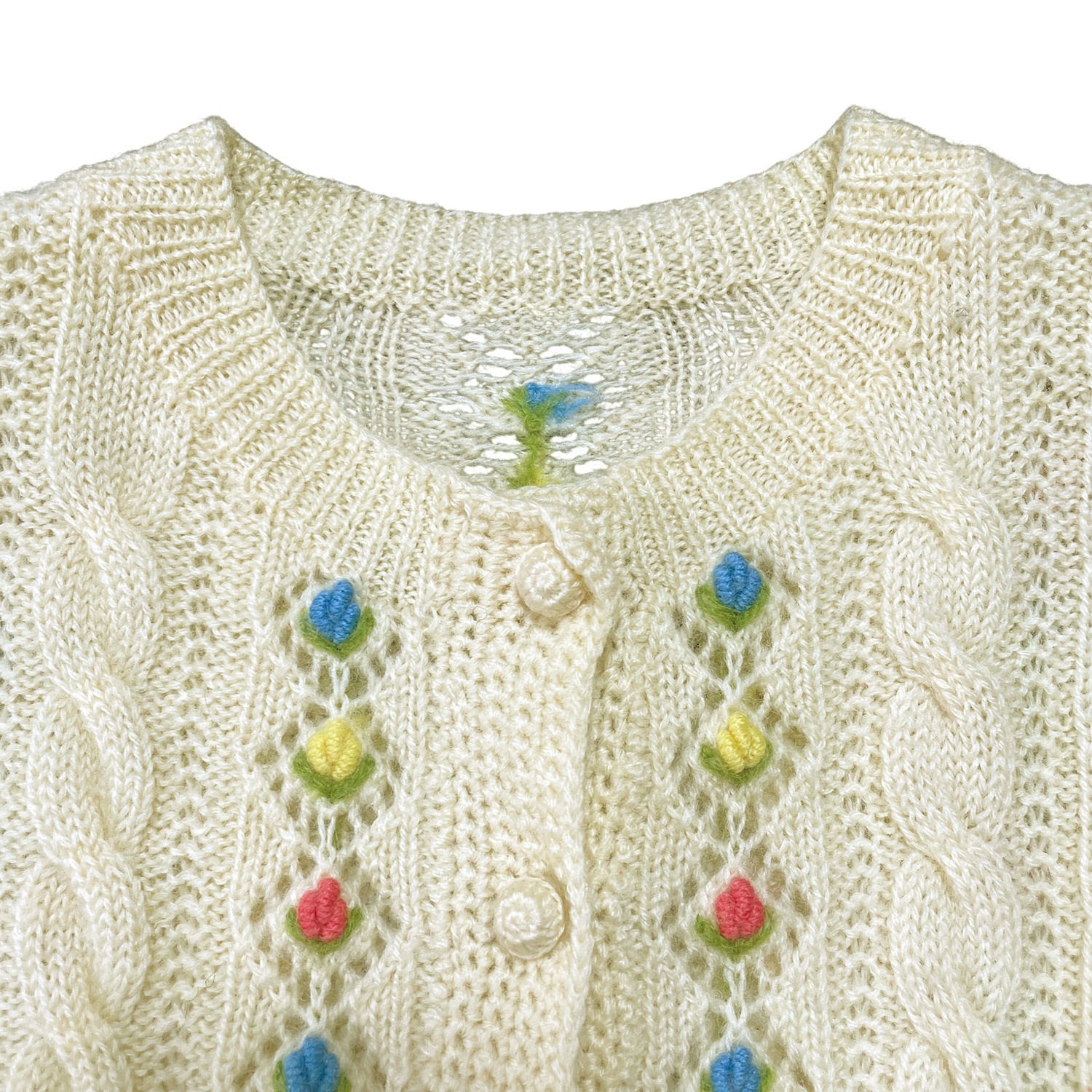 USA 古着 60S ヴィンテージ ウールニット ケーブル 小花模様 カーディガン レディースXS BH0412