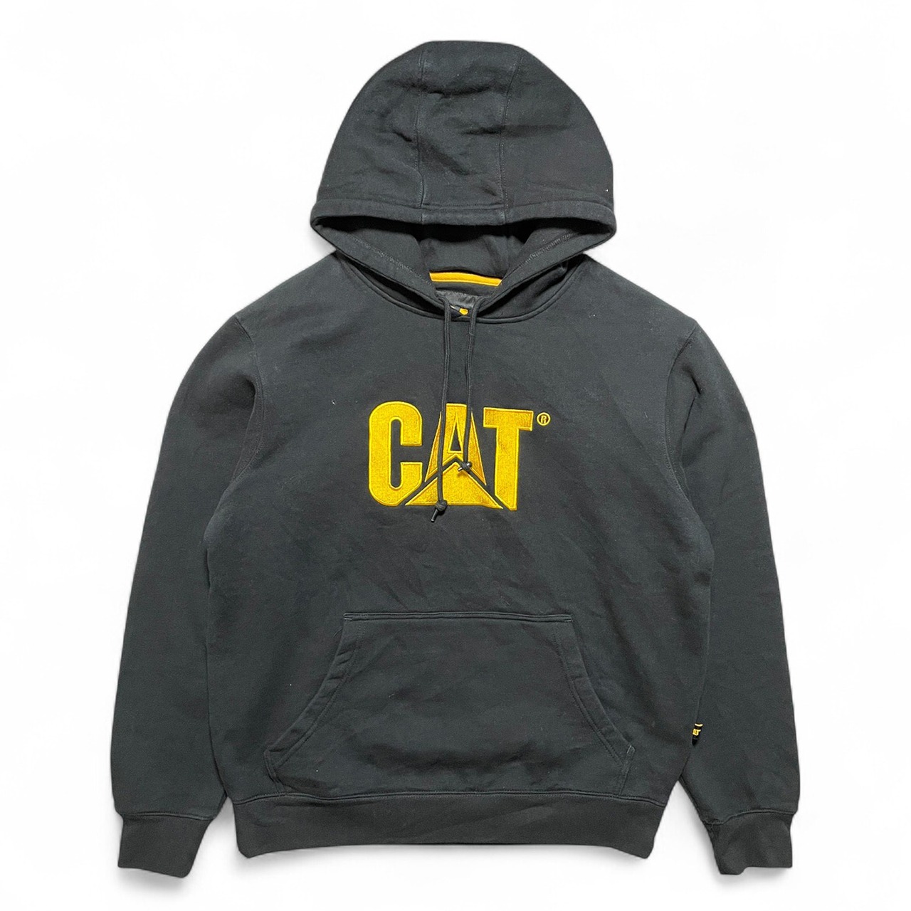 USA 古着 Caterpillar キャタピラー プルオーバー スウェット パーカー ロゴ プリント ブラック メンズM 裏起毛 BE0860