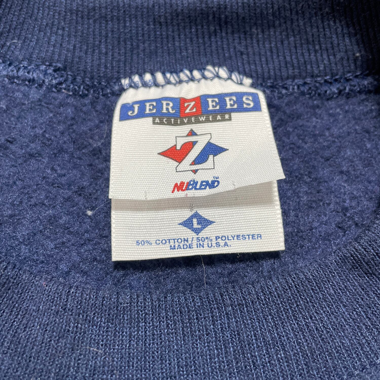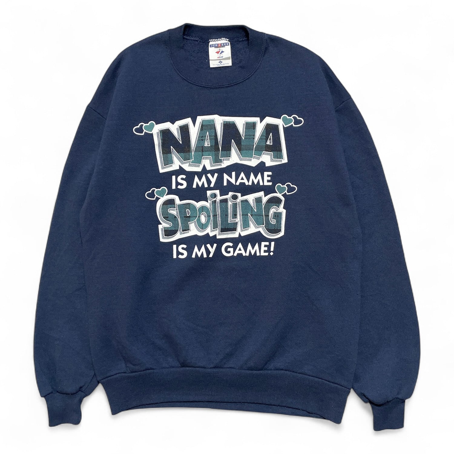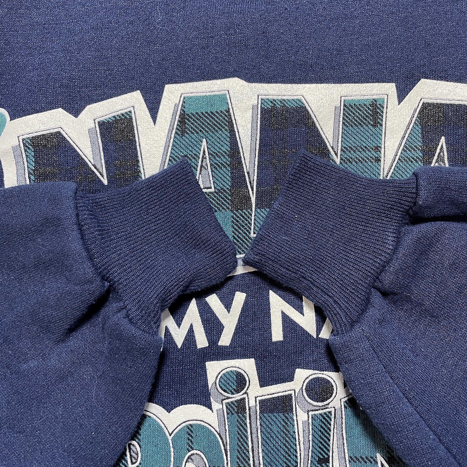 古着 USA製 90S 「私はナナ、甘やかすのが得意」 ヴィンテージ クルーネック スウェット トレーナー プリント ネイビー レディースL BD2974